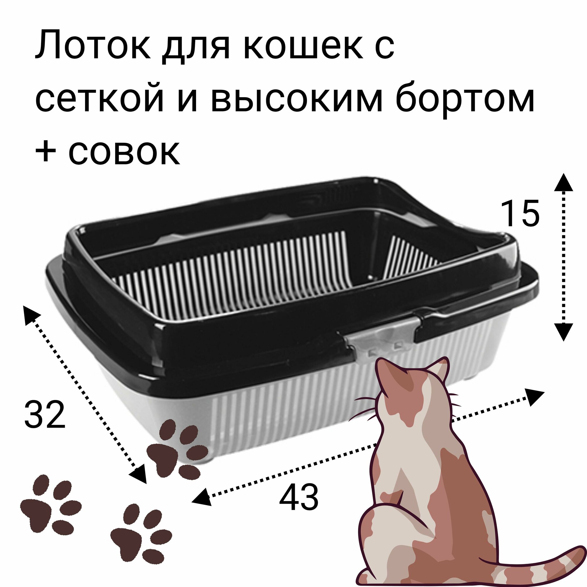 Лоток для кошки с высоким бортом, сеткой и совком. информация: