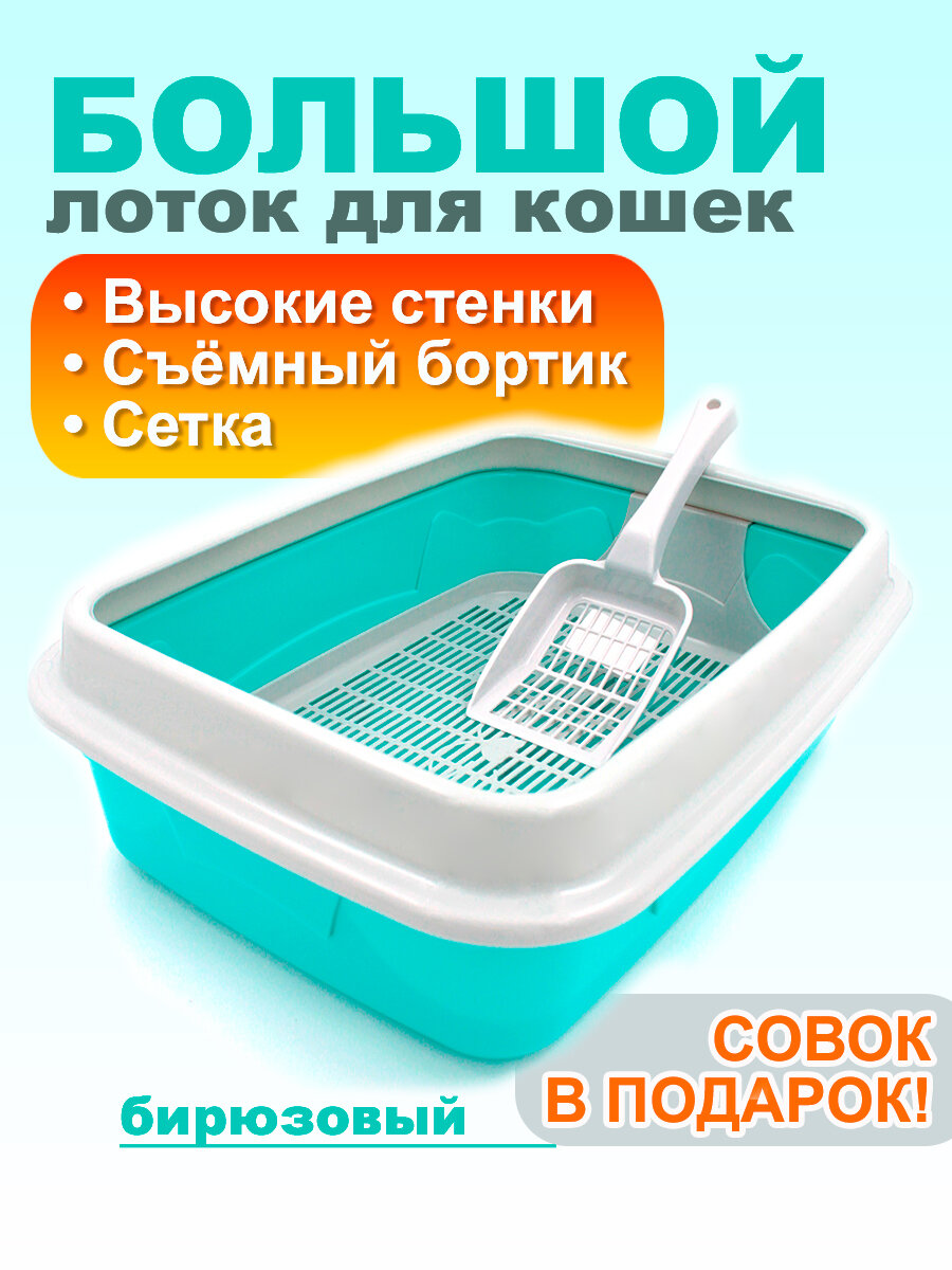 Отзывы на Кошачий туалет большой с сеткой, съемным бортиком и совком, бирюзовый
