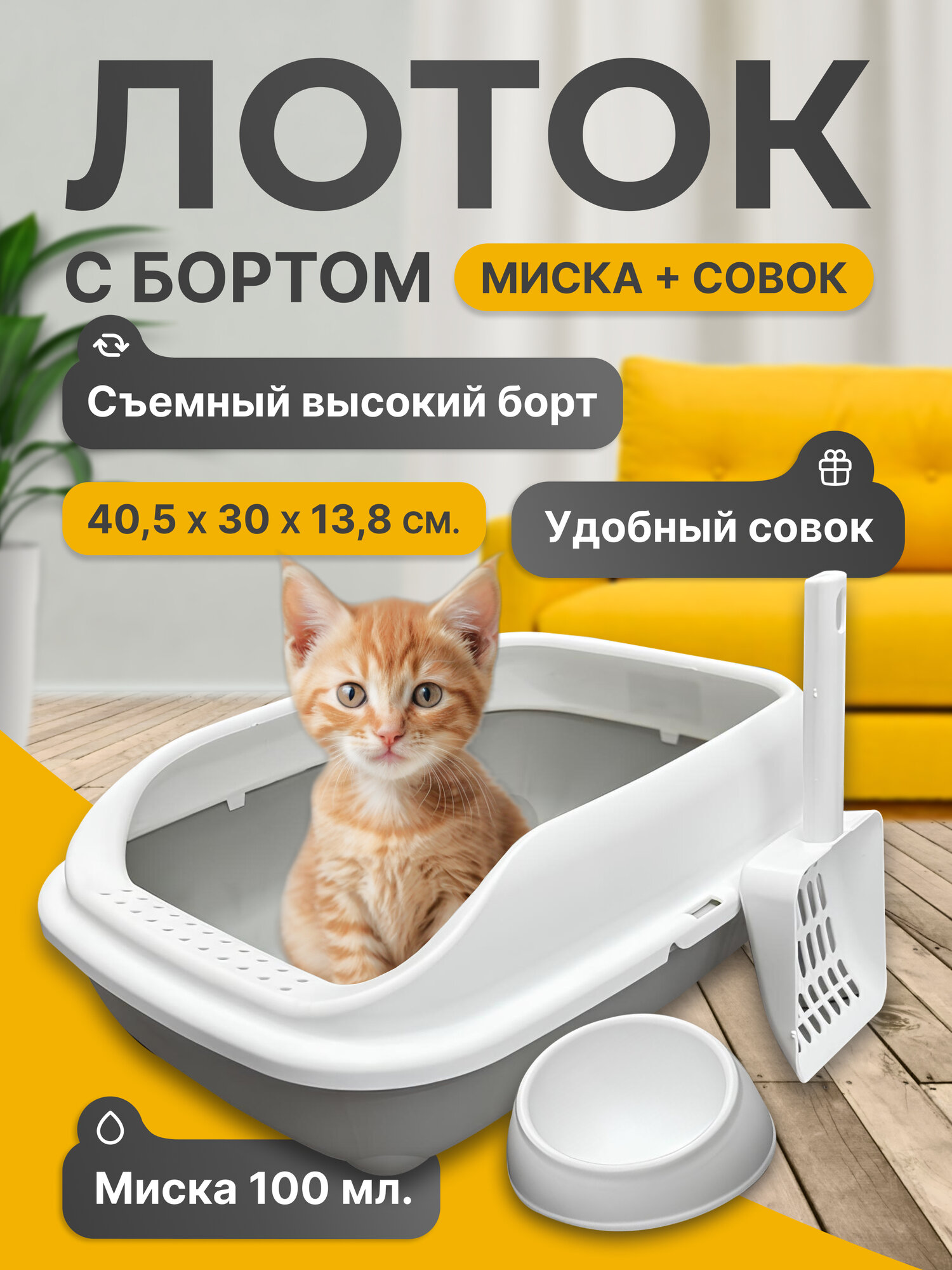 10 цен на Лоток для кошек, 40.5х30х13.8 см, высокий съемный борт, порог-грязесборник, совок, миска, серый