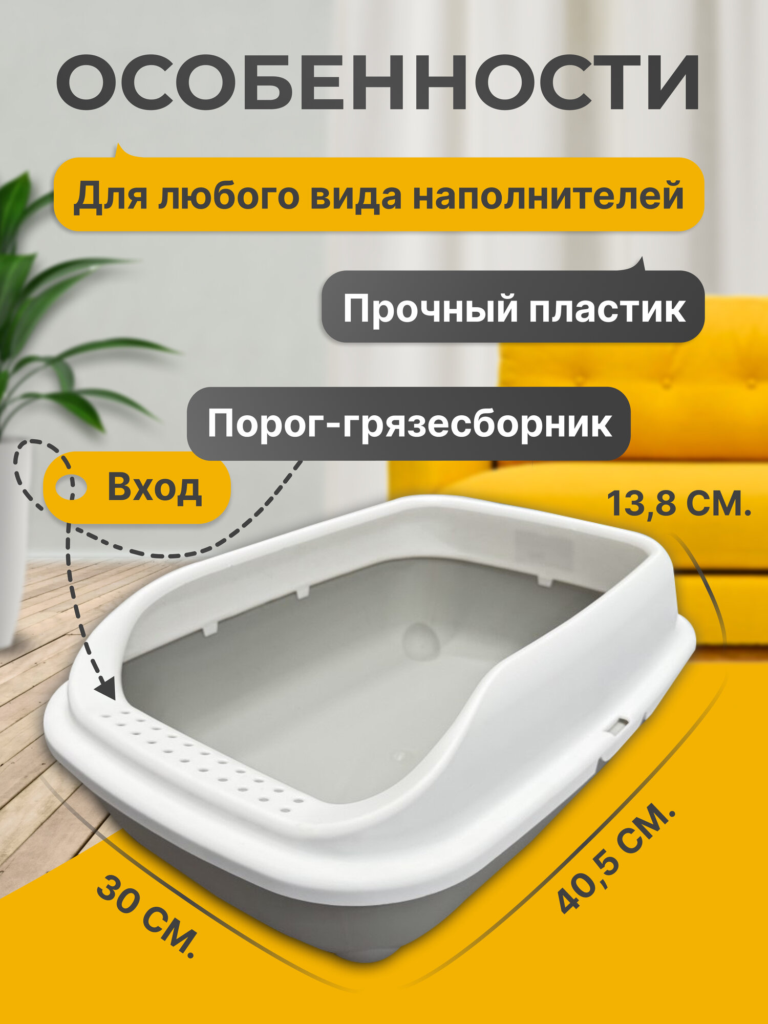 Лоток для кошек, 40.5х30х13.8 см, высокий съемный борт, порог-грязесборник, совок, миска, серый информация: