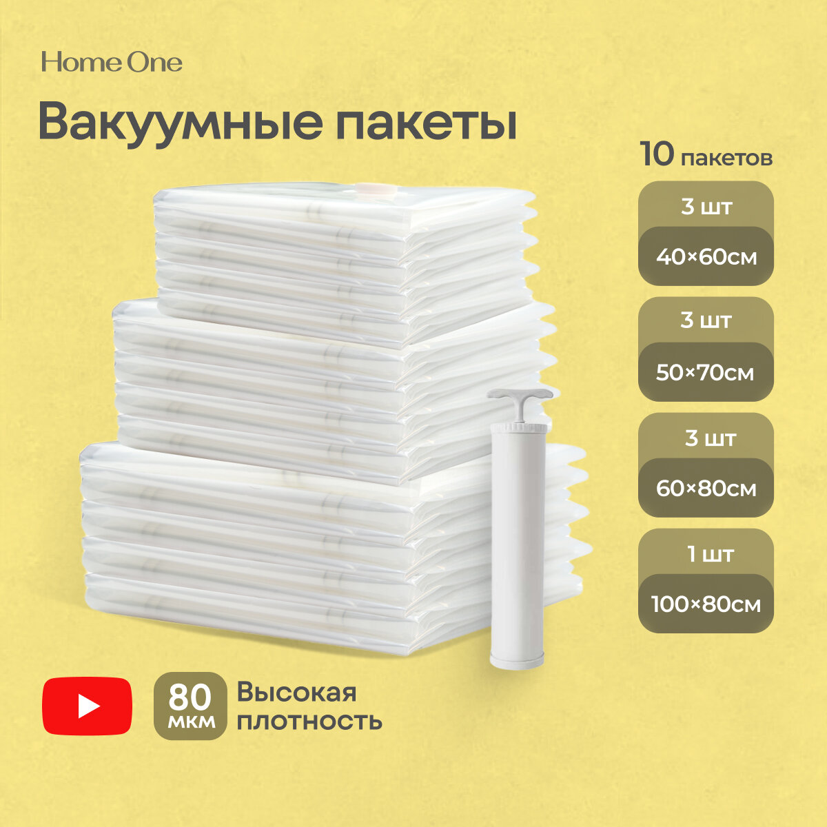 Набор вакуумных пакетов Home One (50х70см 3шт, 40х60 см 3шт, 60х80 см 3шт, 80х100 см 1шт, ручной насос) информация: