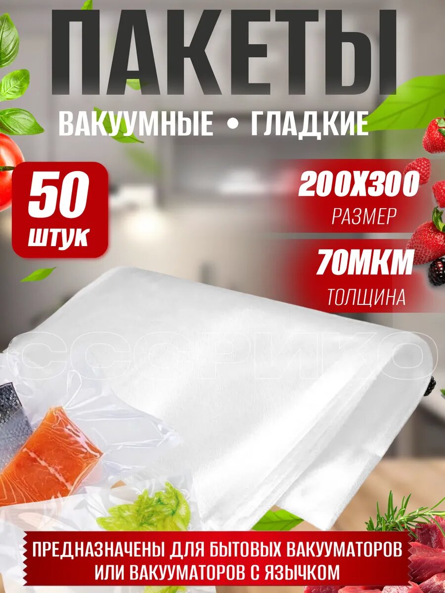 Вакуумные пакеты, гладкие, для вакууматоров, 20х30 см, 50 штук, 70мкм толщина информация: