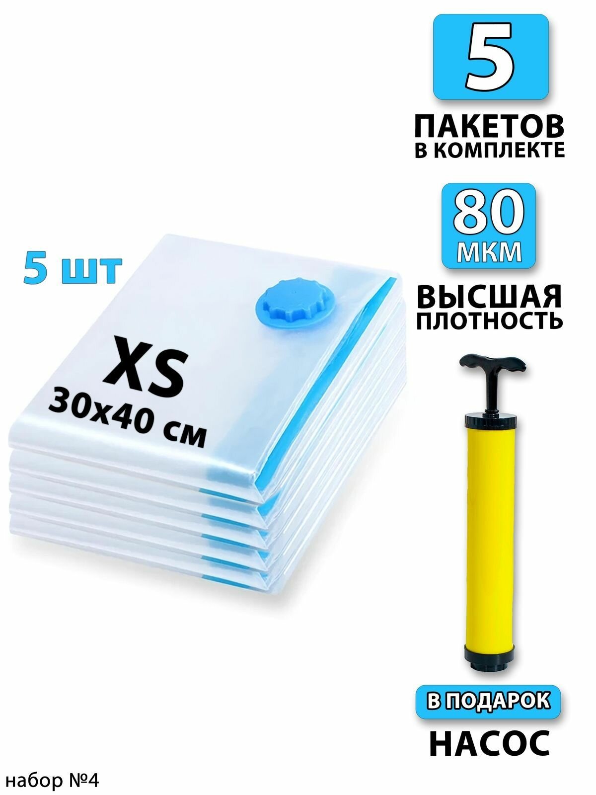 Вакуумные пакеты для одежды 4 шт. Набор: 35х40 - 1шт. 40х50 - 1шт. 50х60 - 1шт. 60x80 - 1шт. Насос - 1шт. Для дома с клапаном, для хранения вещей, мешки для игрушек, одеял, с двойным замком 1 104 ₽