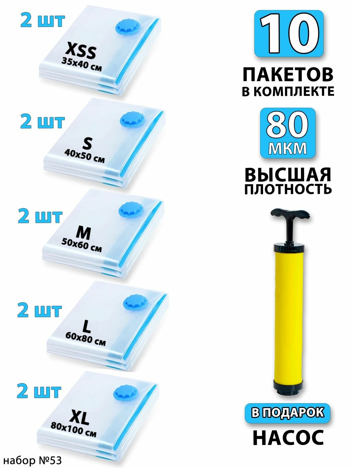 10 цен на Вакуумные пакеты для одежды 10 шт. Набор: 35х40 - 2шт. 40х50 - 2шт. 50х60 - 2шт. 60x80 - 2шт. 80x100 - 2шт. Насос - 1шт. Для дома с клапаном, для хранения вещей, мешки для игрушек, одеял, с замком