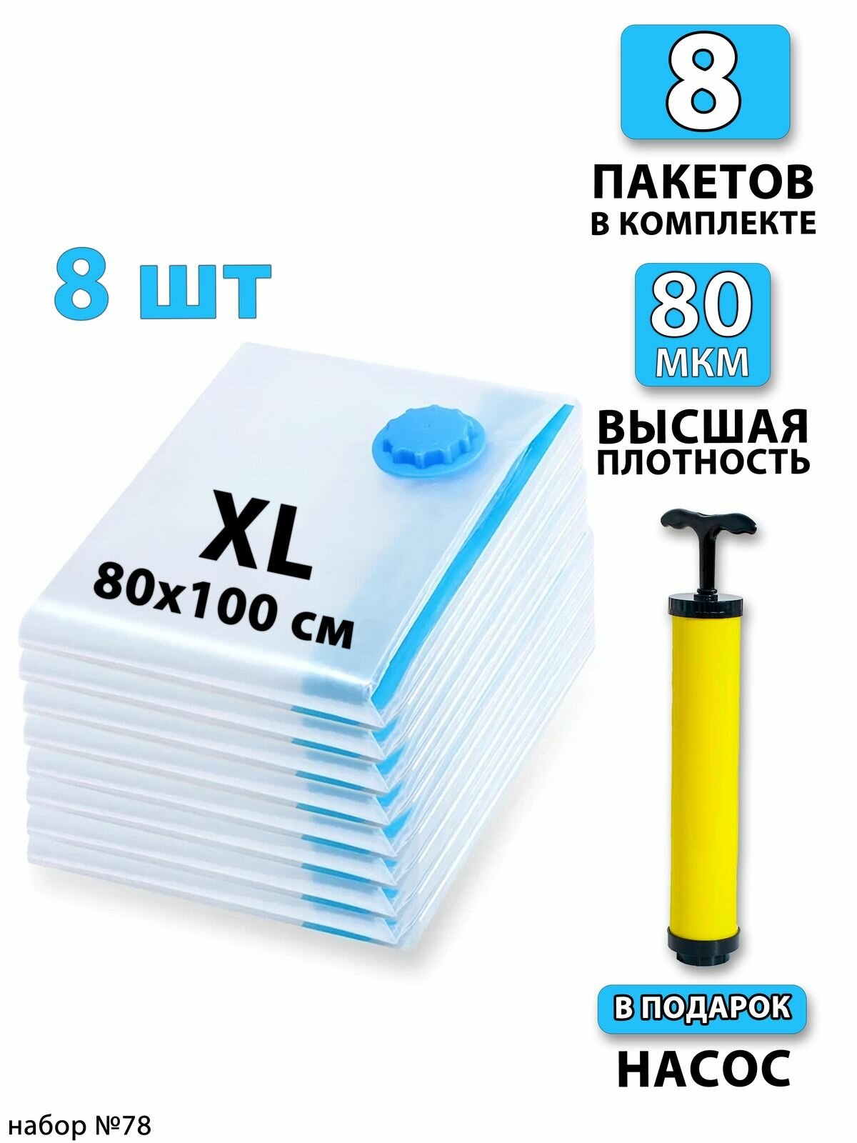 Вакуумный пакет для одежды 8шт. 80х100 - 8шт. Насос - 1шт. Для дома с клапаном, для хранения вещей, мешки для игрушек, одеял, с двойным замком информация: