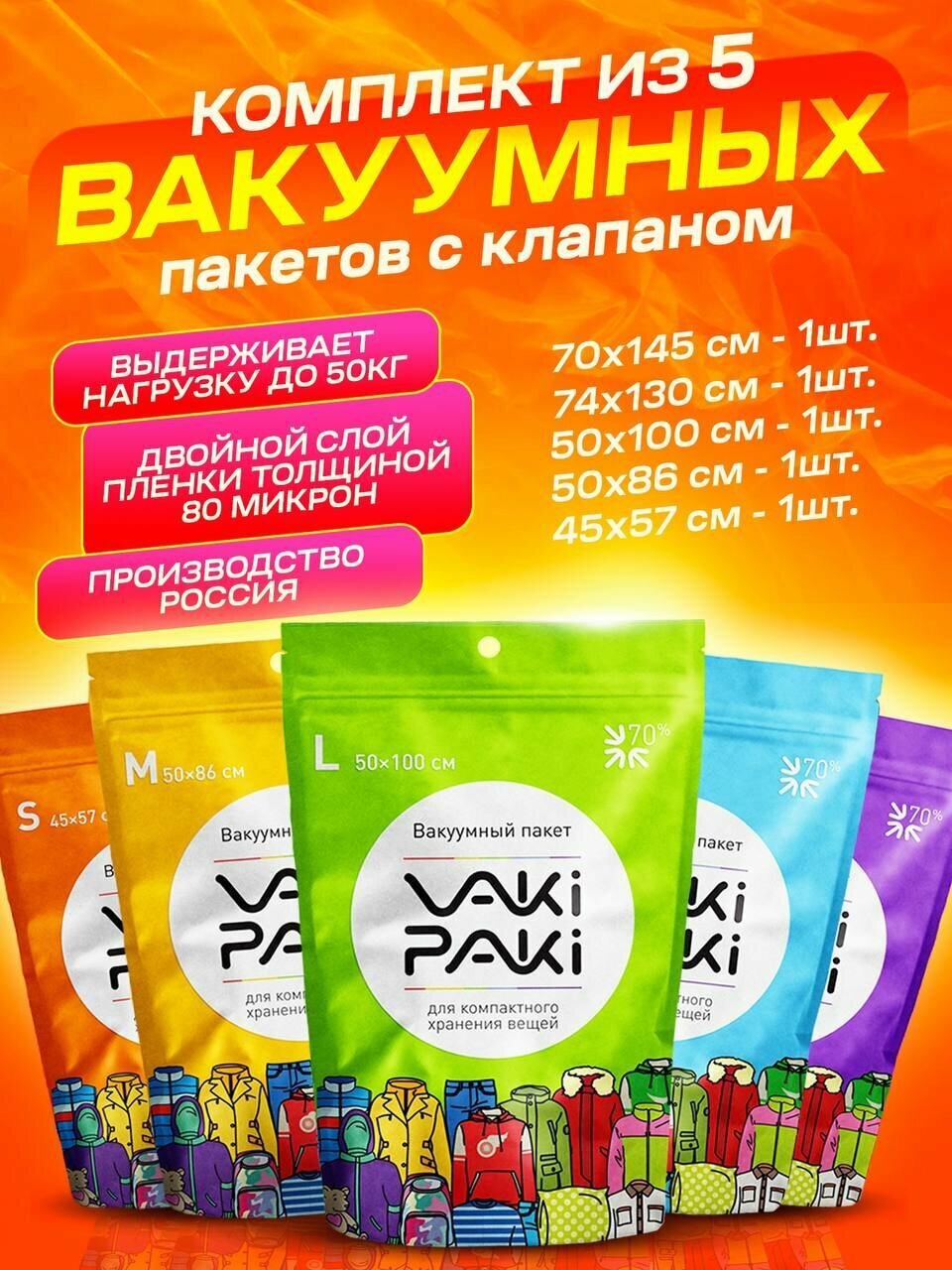 Набор высокопрочных вакуумных пакетов с клапаном для хранения одежды VakiPaki 5 штук информация: