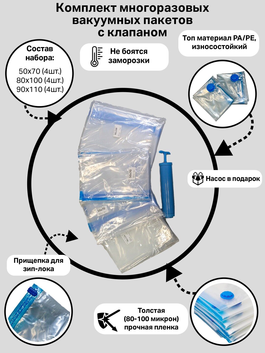 Набор вакуумных пакетов PA/PE (полиамид) с клапаном и насосом информация: