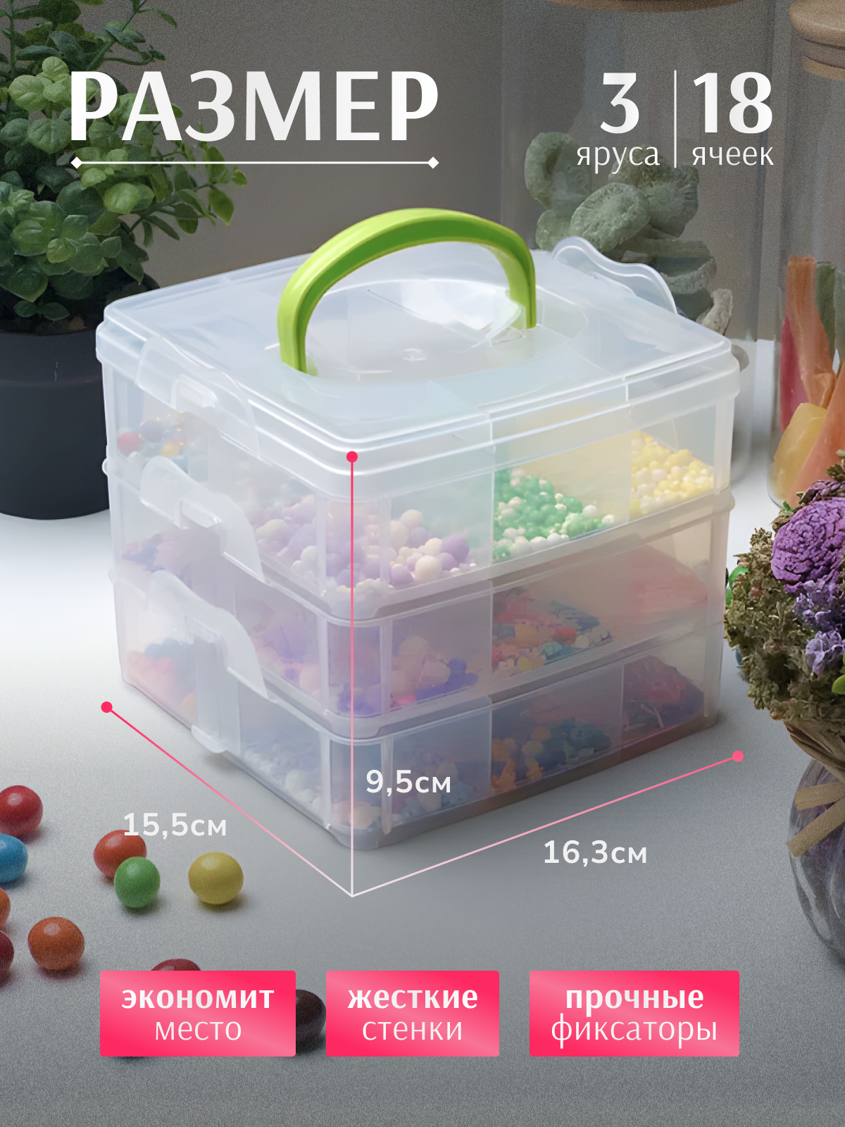 Органайзер для мелочи, канцелярии, шитья 3 съемные секции, ручка, 18 ячеек, 16,3x15,5x14 см, прозрачный информация: