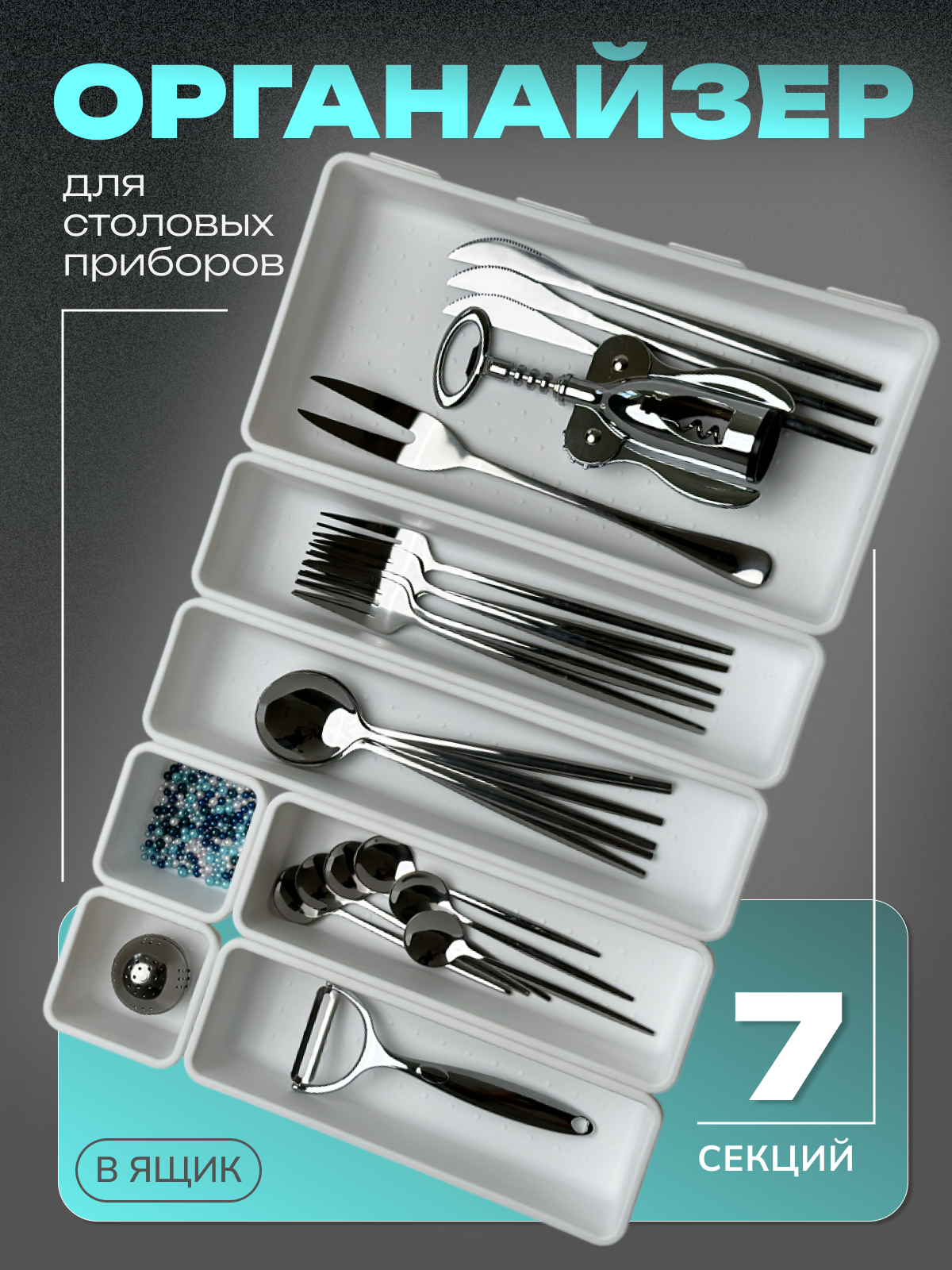 Отзывы на Органайзер для столовых приборов, канцелярии, косметики, мелочи, 46x31x5 см, 7 ячеек, белый