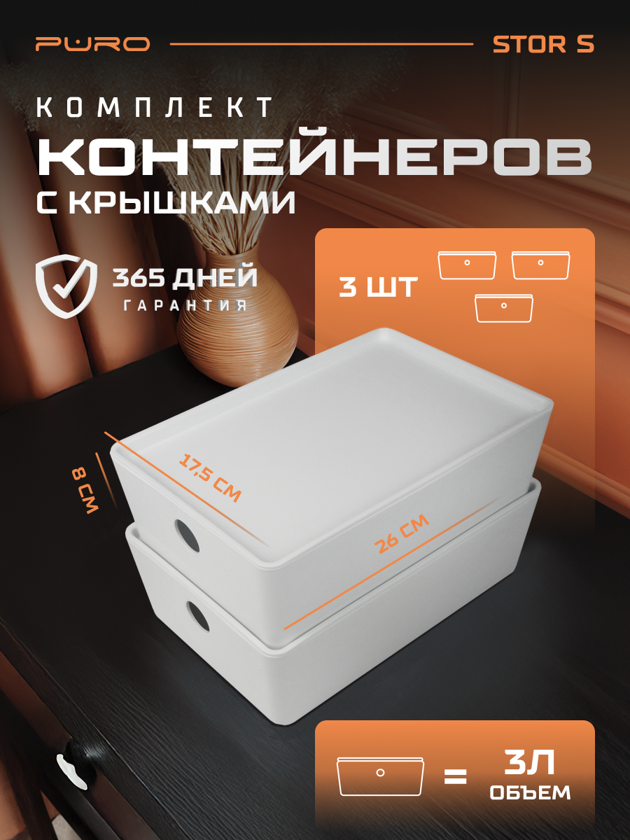 Комплект контейнеров с крышкой для хранения PURO STOR S, 3шт, белые информация: