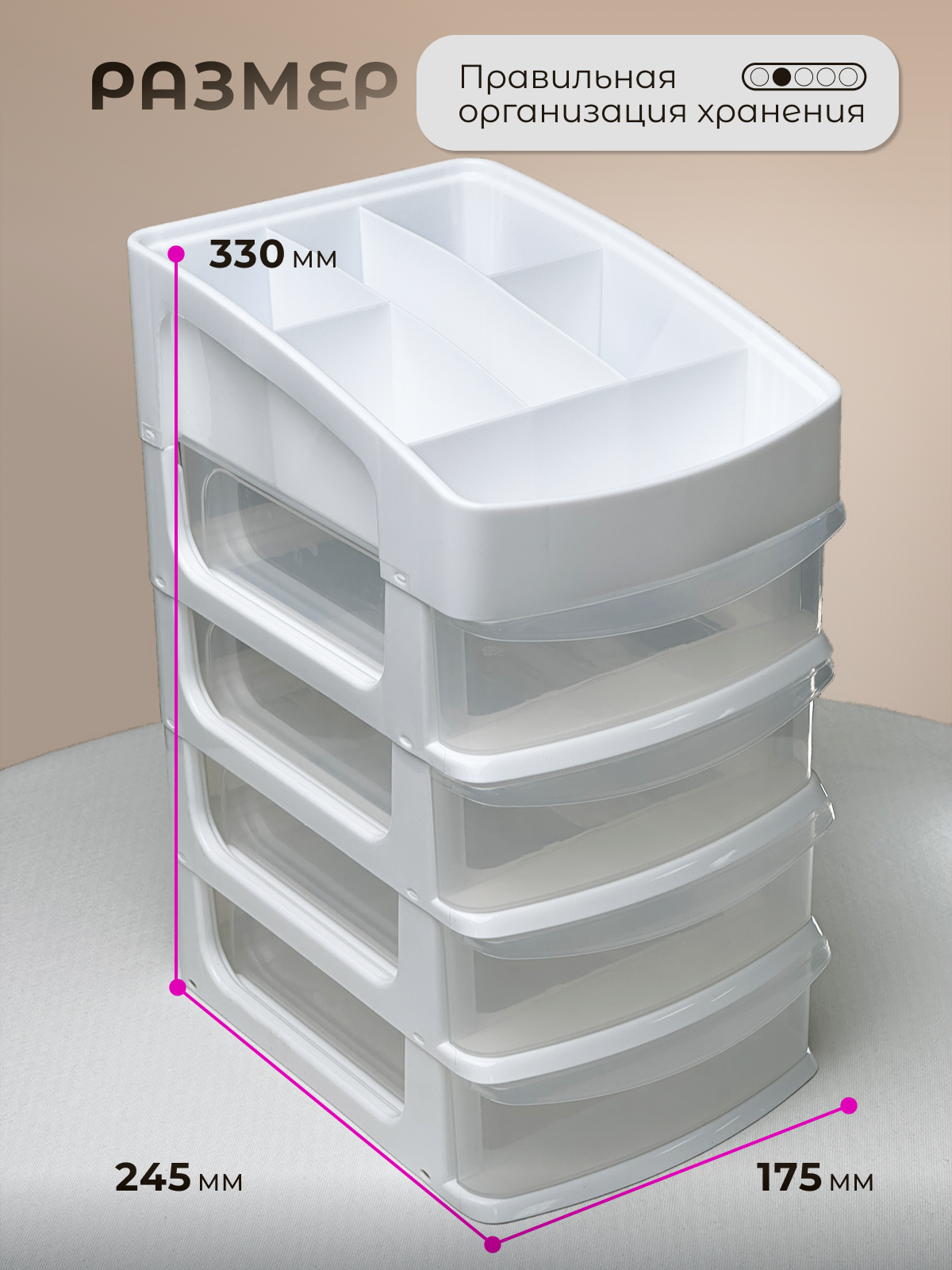 Отзывы на Органайзер для косметики, мелочей, канцелярии, лекарств, шитья, пластик, 4 ящика, прозрачный, белый, 17,5х24,5х33 см