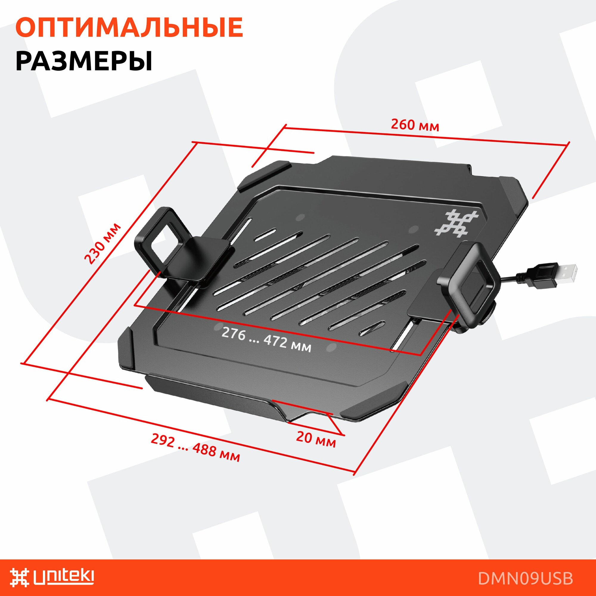Полка подставка для ноутбука, крепление VESA к кронштейну, держатель планшета, на кронштейн, диагональ 12-17 дюймов UNITEKI DMN09USB с охлаждением и подсветкой RGB информация: