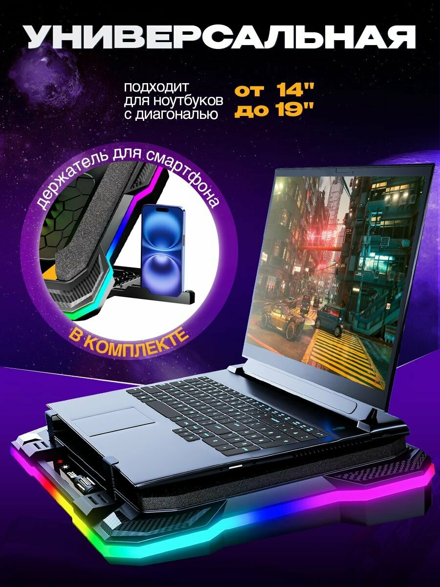 Регулируемая охлаждающая подставка для ноутбуков, 2 вентилятора, подсветка, 5 углов наклона, держатель для смартфона, 2 USB , для экрана 13"-19"