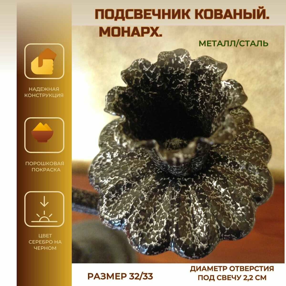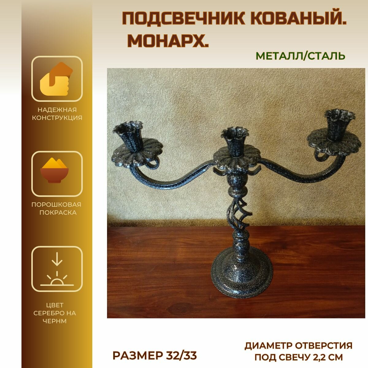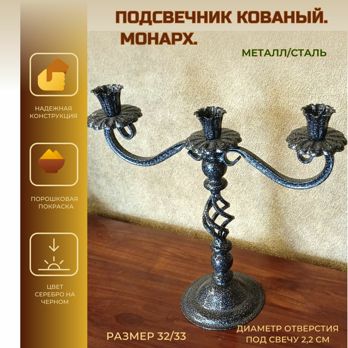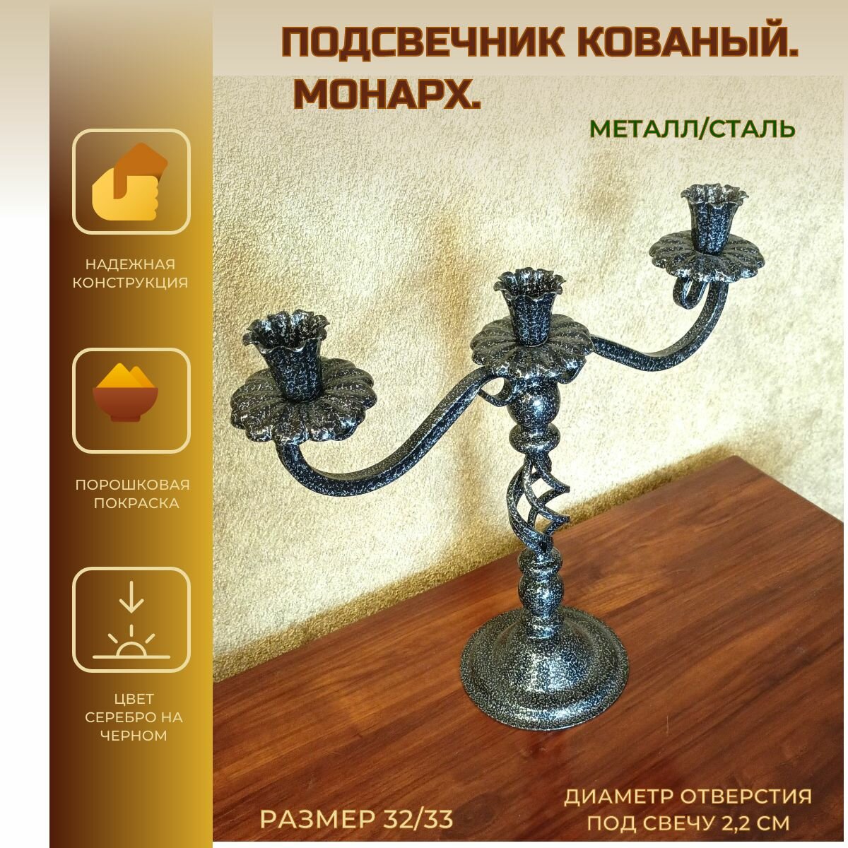 10 цен на Подсвечник-канделябр Монарх, кованый, высокий на 3 свечи, серебро на черном, выс.32, шир.33, d. отв. под свечу до 2,2 см