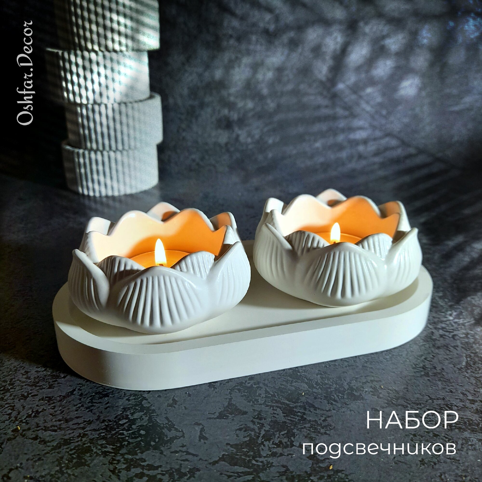 Подсвечники "Лотос" на подставке овальной / Гипс / Набор 3 предмета. Подарок на новый год. Oshfar Decor информация: