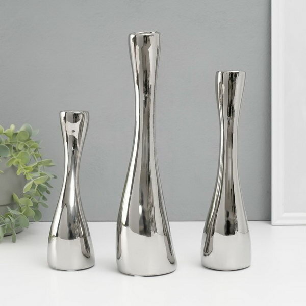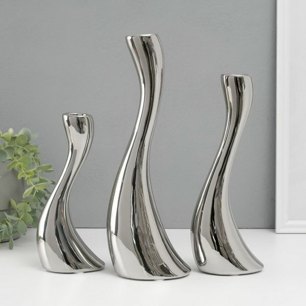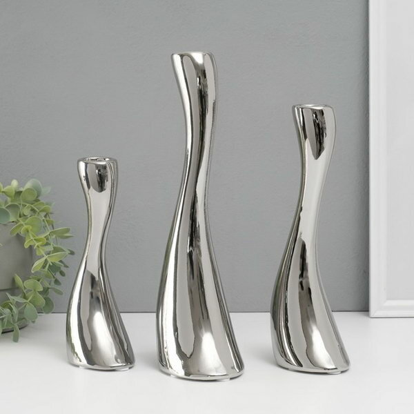 10 цен на Подсвечник керамика на 1 свечу "Волна", набор 3 шт, d=2.5 см, серебро, h=20; 25; 30 см