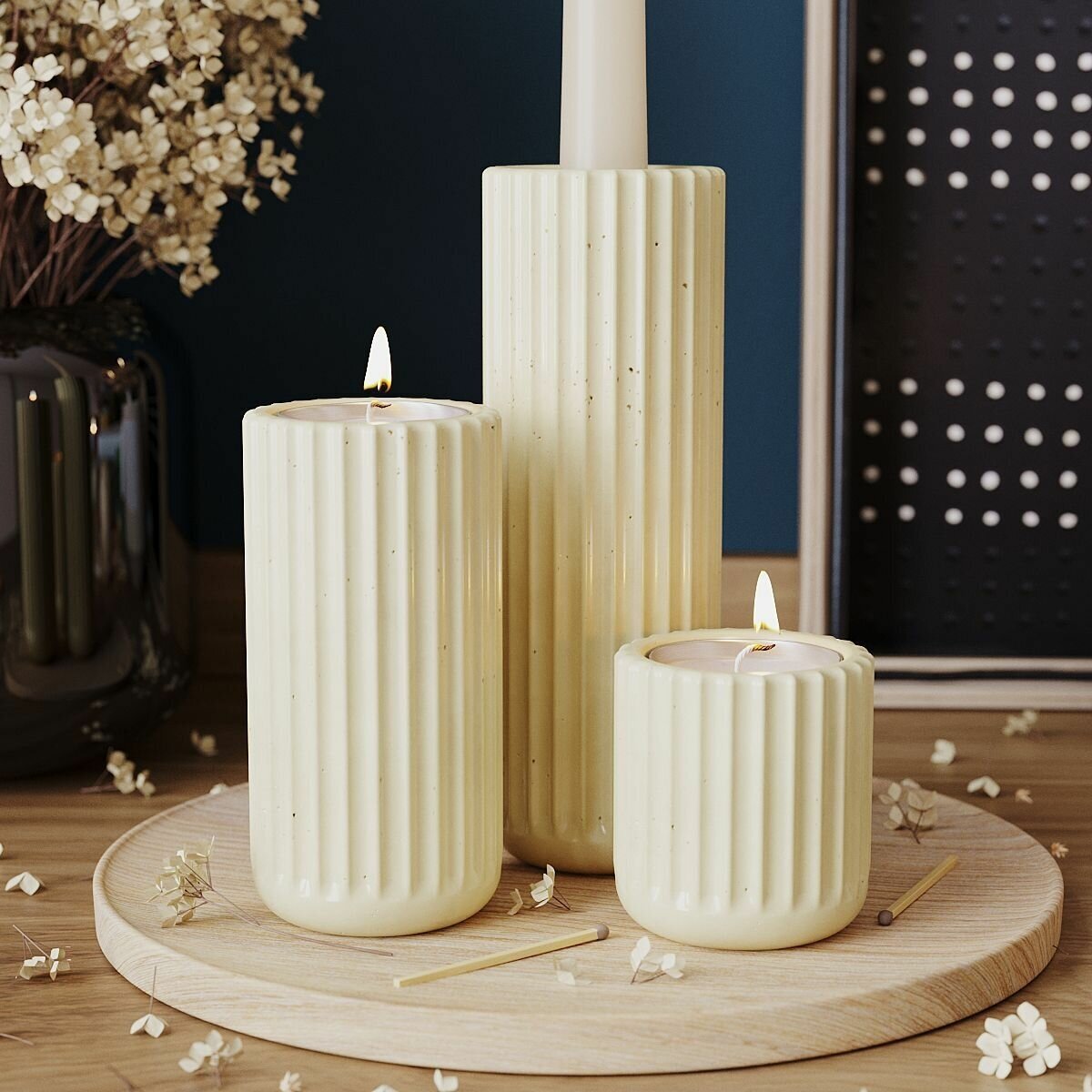 Набор подсвечников Chloe Slim S, M, L для столовых и чайных свечей (всего 3 шт.), бетон, кремовый глянцевый