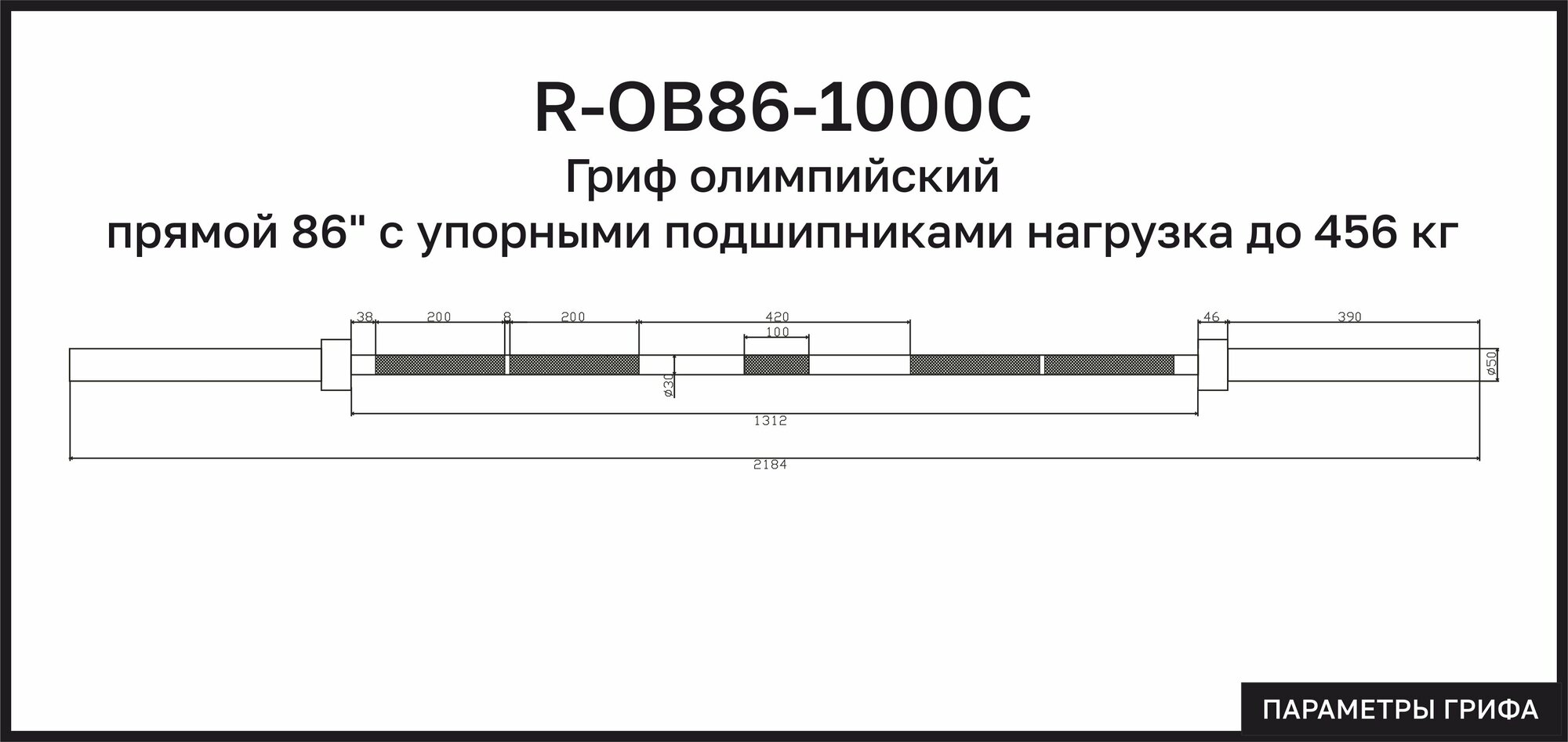 Гриф олимпийский прямой 86" с упорными подшипниками нагрузка до 456 кг REBEL информация: