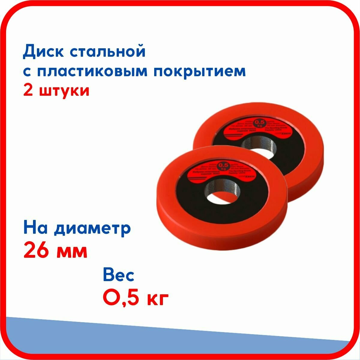 Отзывы на Пара дисков (блинов) по 0,5 кг, стальные облитые пластиком, на гриф для гантели, штанги диаметром 26 мм