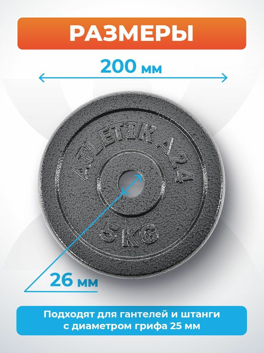 Блины для гантели и штанги 10 кг Atletika24 набор 2 шт. по 5 кг; чугунные диски для штанги/гантелей 25 мм информация:
