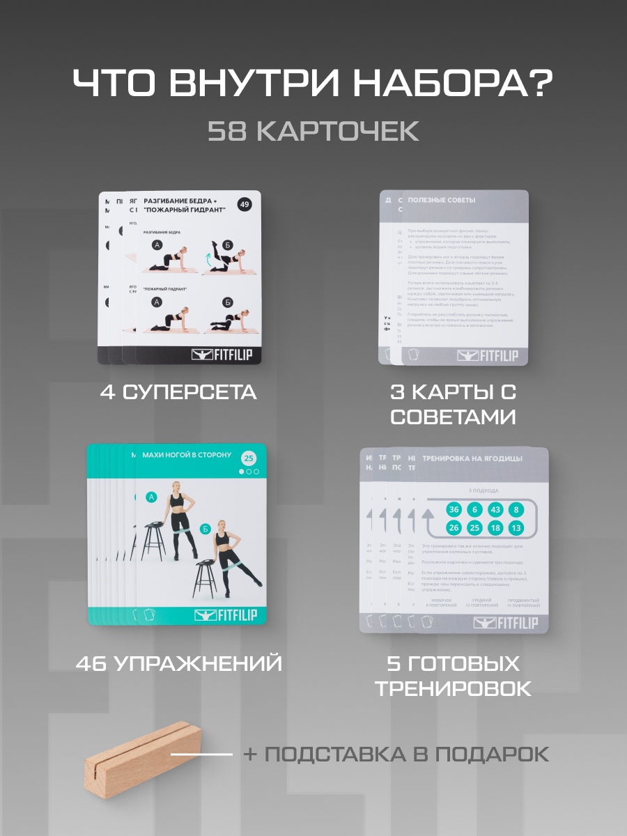 10 цен на Карточки для тренировки ног и ягодиц с фитнес резинками, карты 58 штук с фото и видео упражнениями