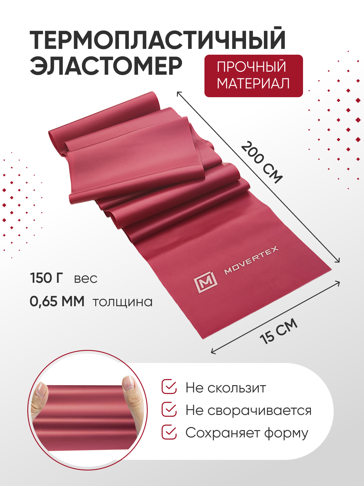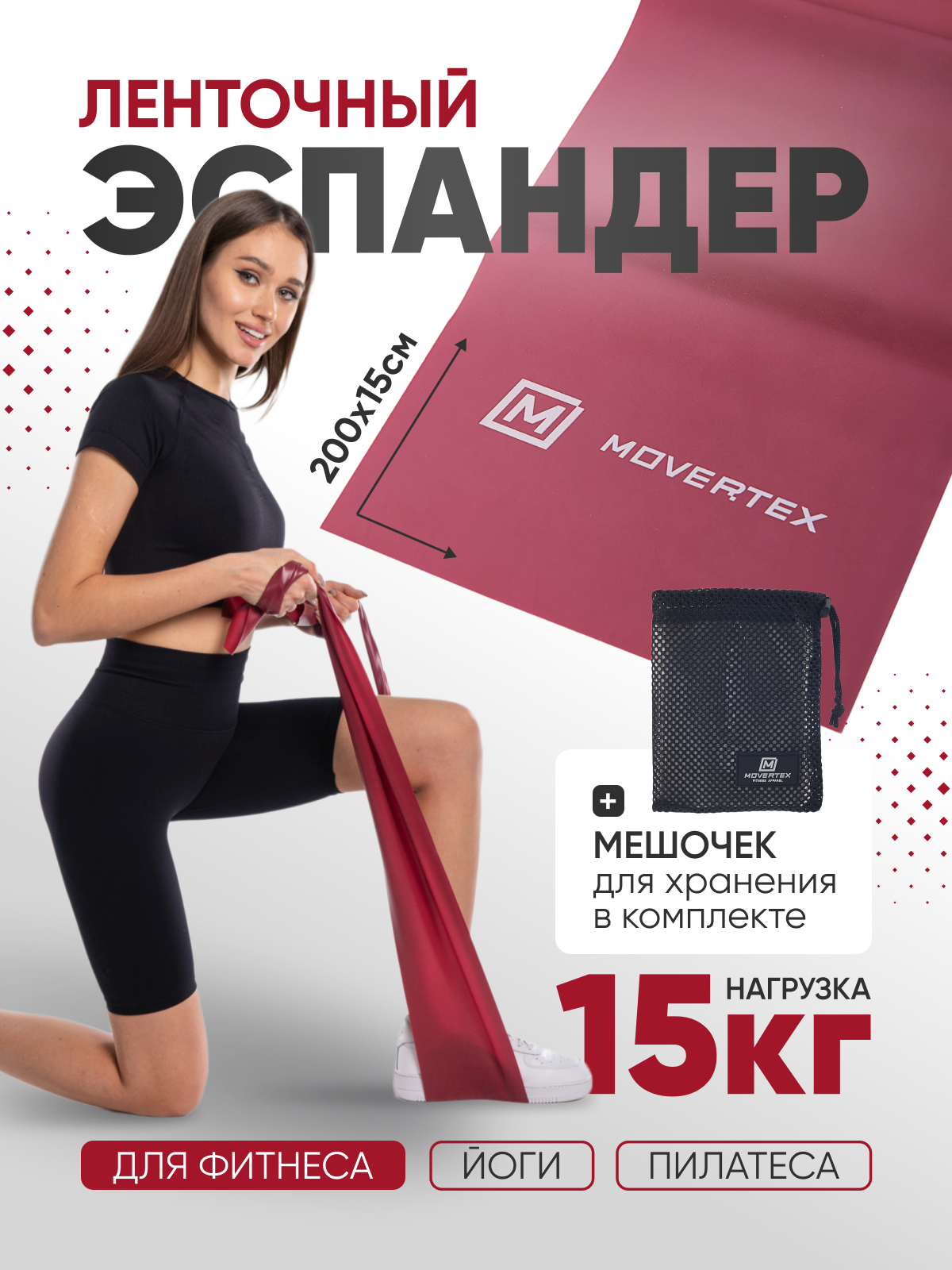 Эспандер ленточный, фитнес резинка - лента для занятий йогой и пилатес 15кг, 2000*150*0,65мм MOVERTEX информация: