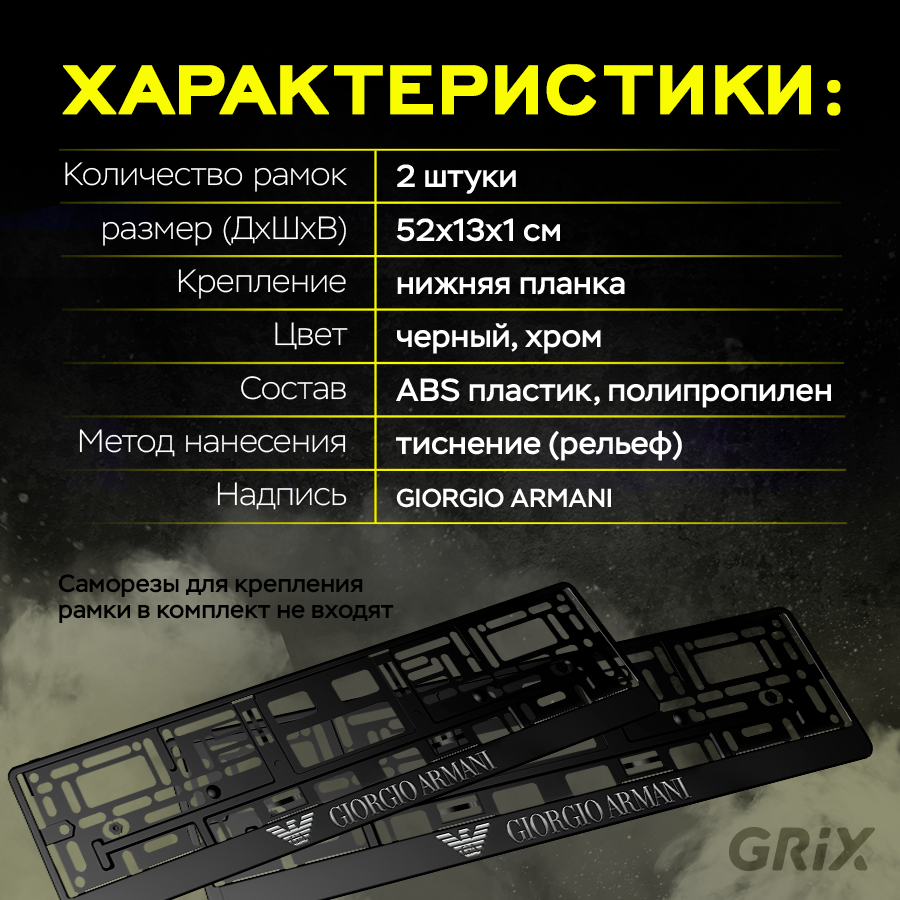 Grix Рамки автомобильные для госномеров с надписью "GIORGIO ARMANI" Набор - 2 шт. информация: