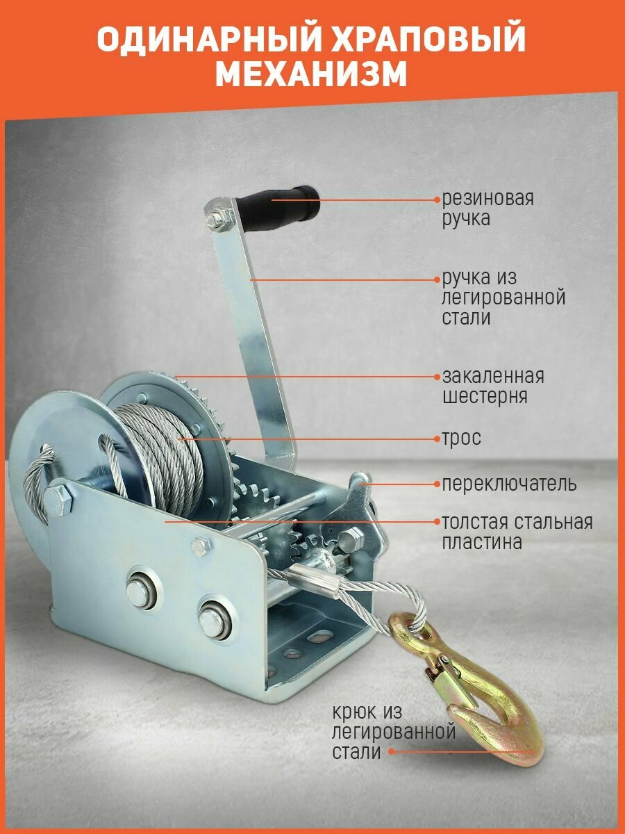 Лебедка ручная барабанная 1100 кг (длина троса 10м/5мм) переносная с двойным храповым механизмом информация: