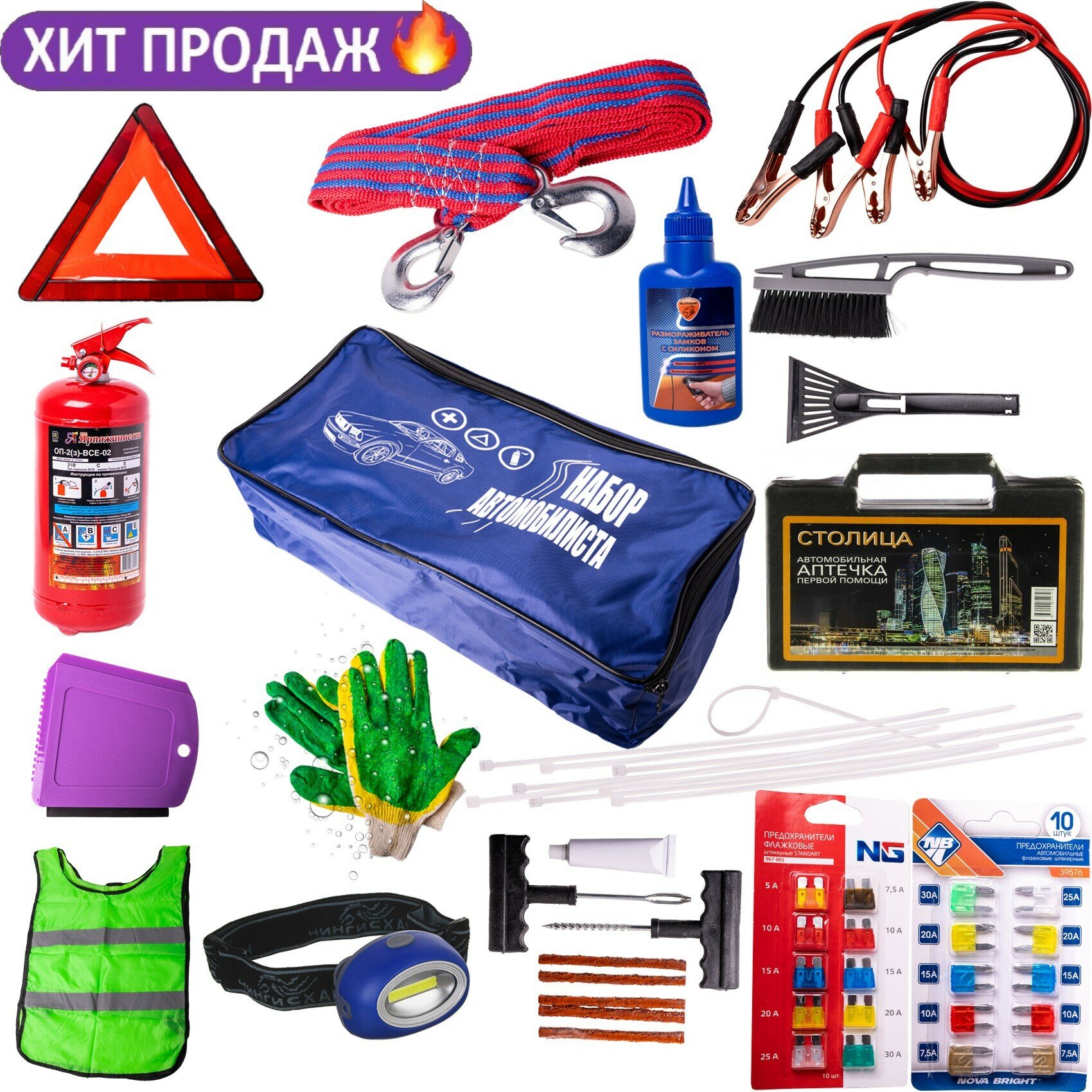 10 цен на Набор автомобилиста N-20 с огнетушителем, аптечкой, с аварийным знаком остановки, со щёткой для снега