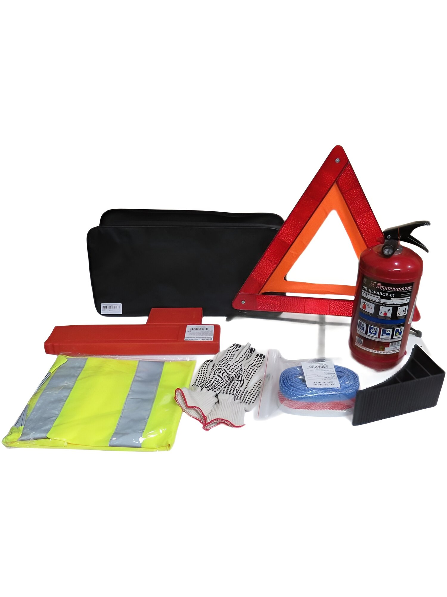10 цен на Набор автомобилиста для техосмотра: огнетушитель, трос, жилет, аптечка, знак а/остановки, упор