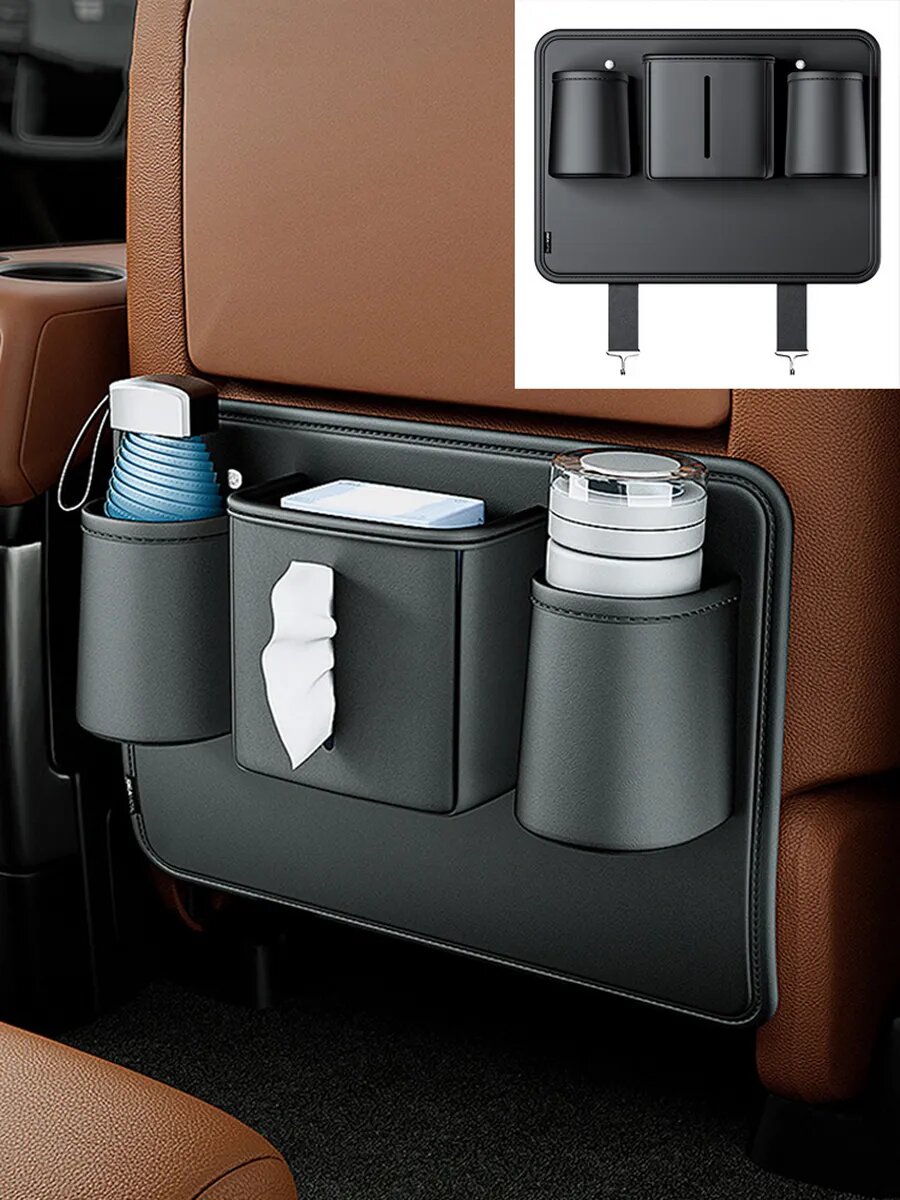 Отзывы на Органайзер для автокресла SEAMETAL - кожаный, с держателем для бутылки и коробкой для салфеток, 48х37 см, черный