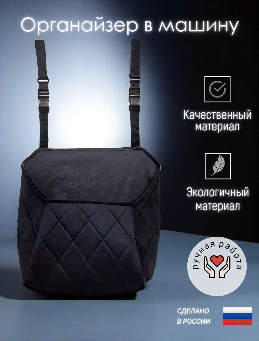 Сумка-органайзер Autozoom в багажник /сумка-саквояж универсальная для автомобиля / кофр в багажник авто. Экокожа черная, стежка двойной синий ромб