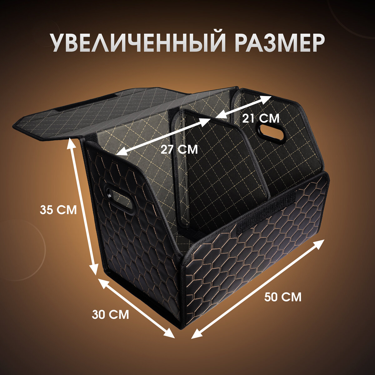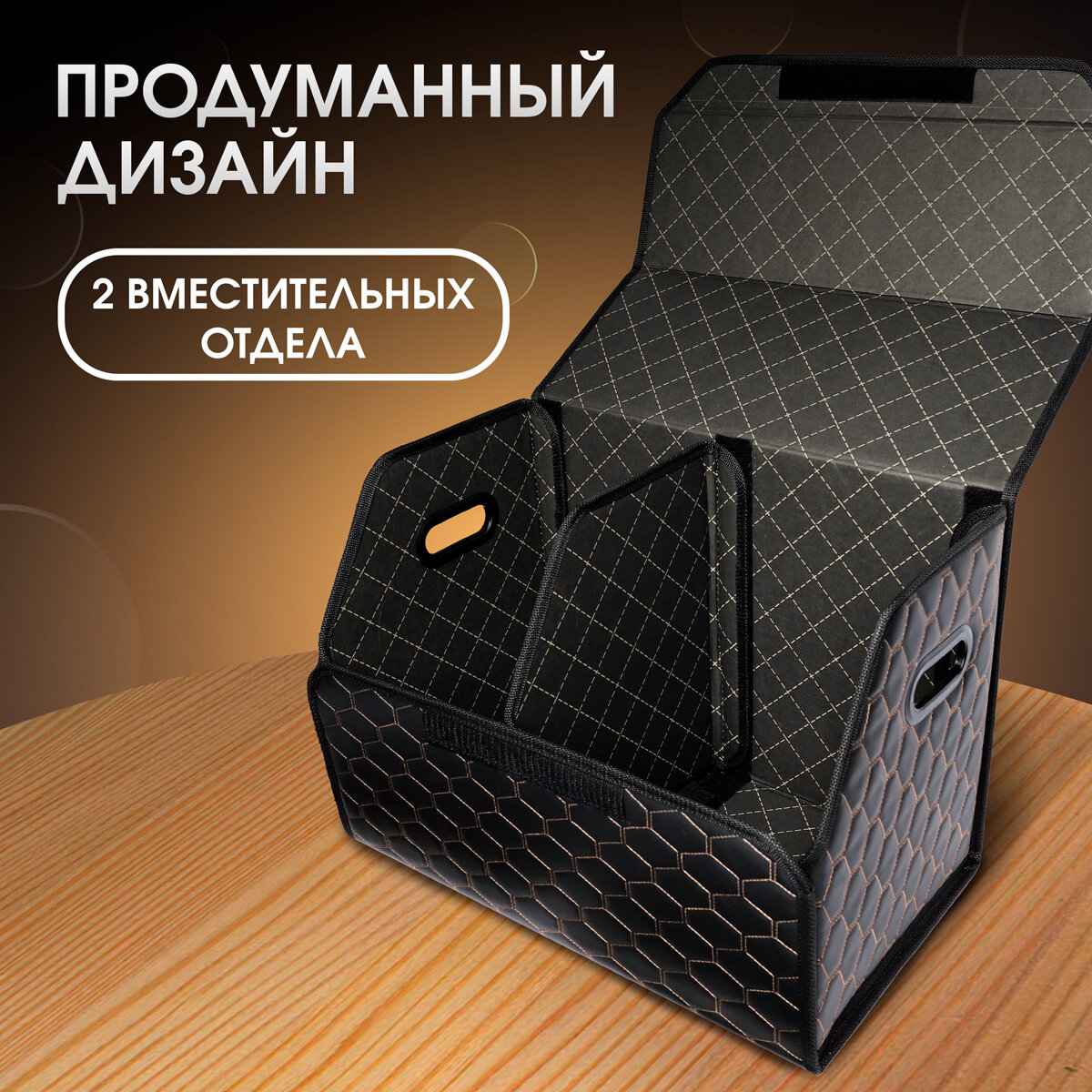 Органайзер в багажник автомобиля. Автомобильный аксессуар для хранения. Модель DIAMOND соты 50*35*30. Чёрный/бежевая строчка информация: