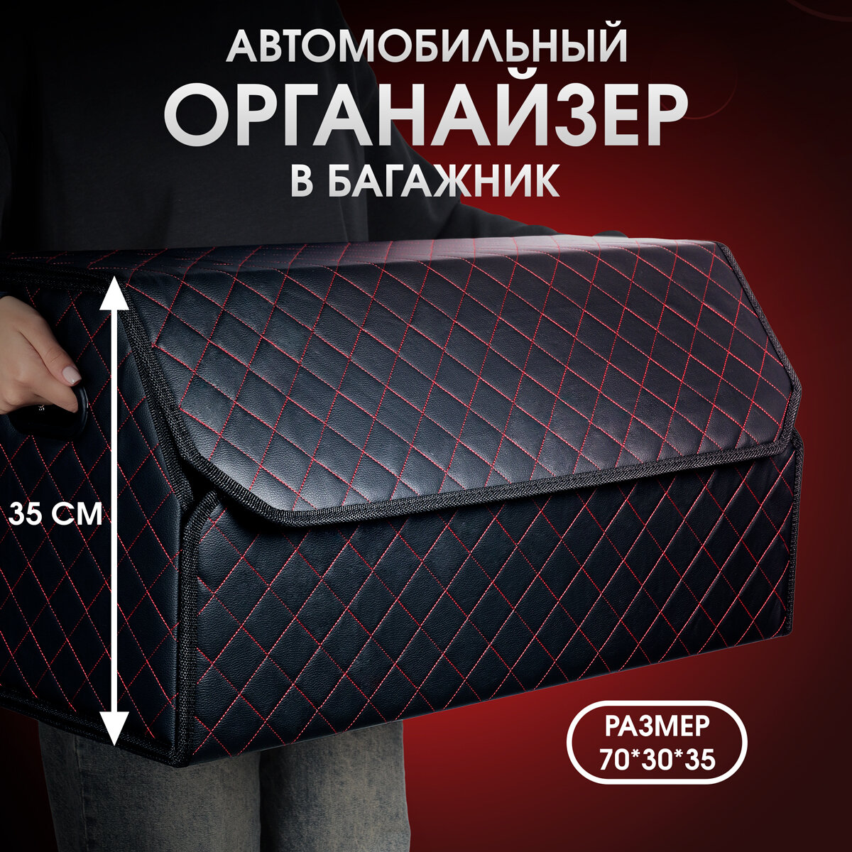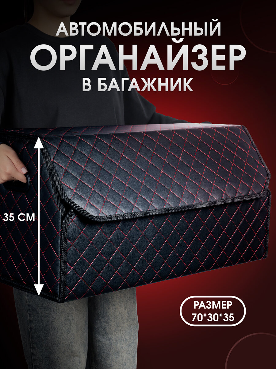 Органайзер в багажник автомобиля. Бокс для хранения в авто 70*35*30. Черный/красная строчка информация: