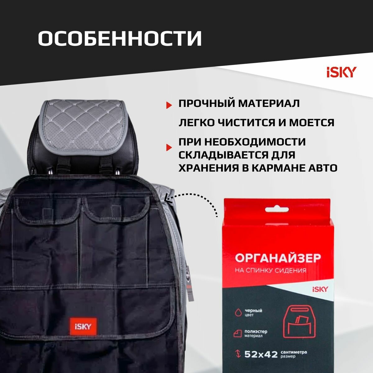 Органайзер на спинку переднего сиденья iSky, полиэстер, 52x42 см, черный арт. iOG-52B информация: