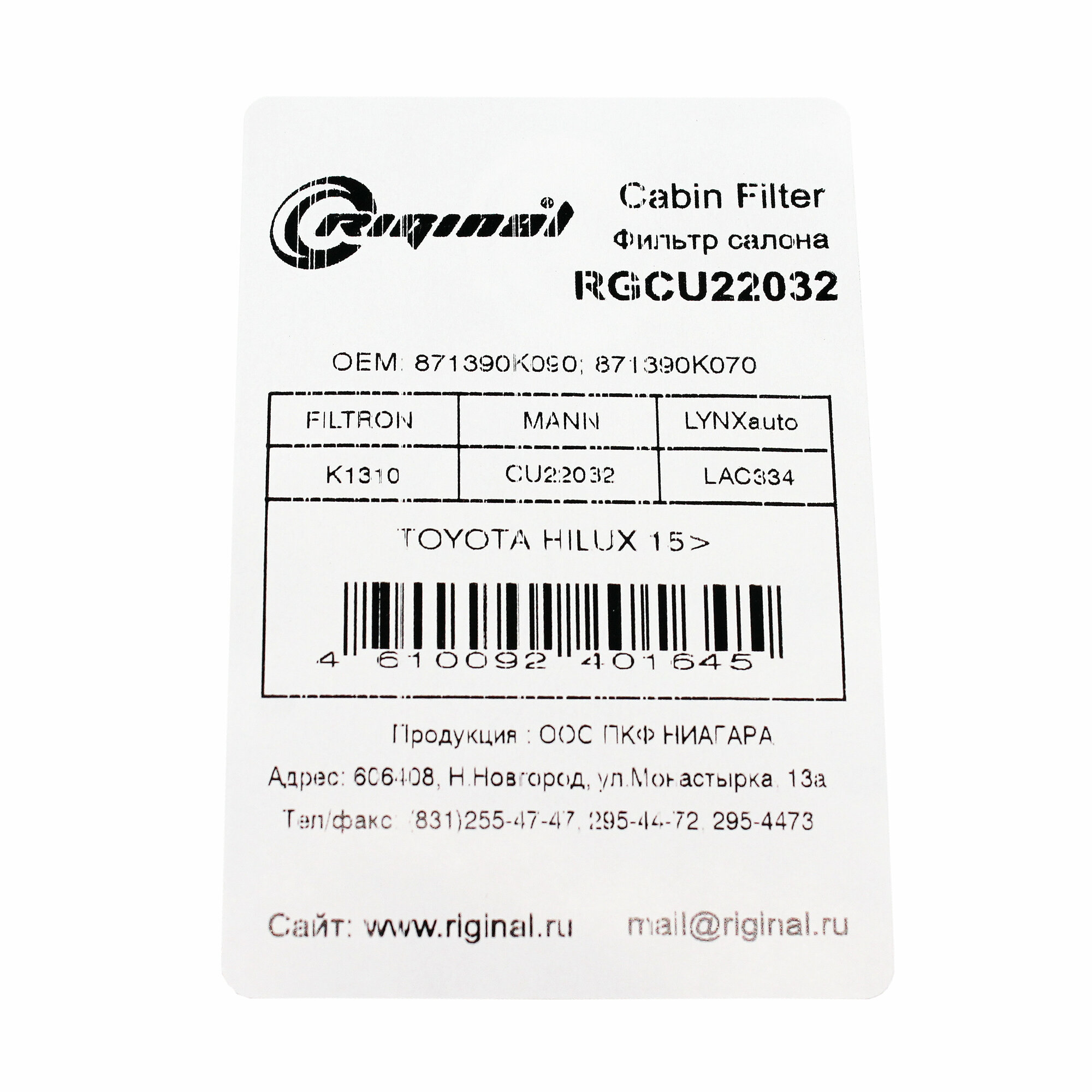 10 цен на Фильтр салона Riginal для а/м Toyota Hilux с 2015 г. в. / Fortuner / Prius, Mazda CX-9