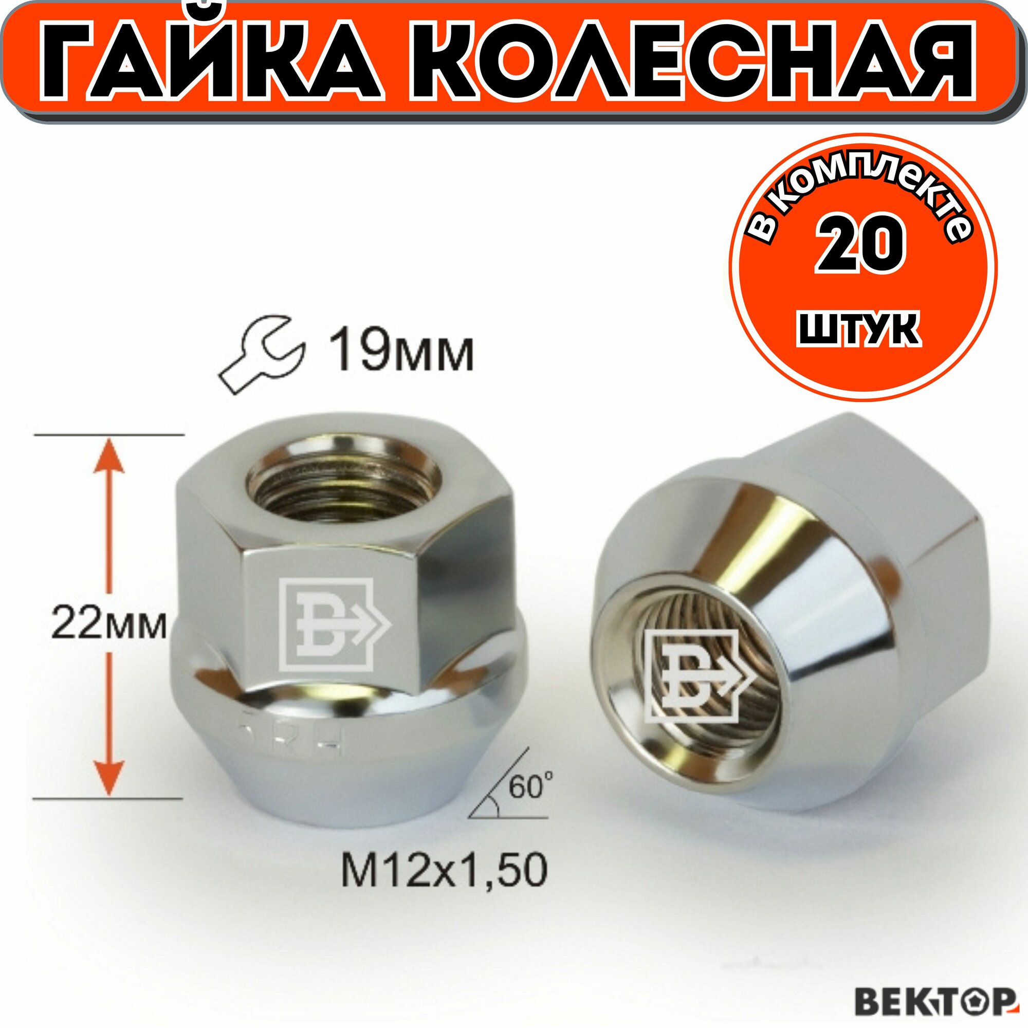 10 цен на Гайки колесные M12X1,50 Хром, высота 22 мм Конус, ключ 19мм, 20 шт