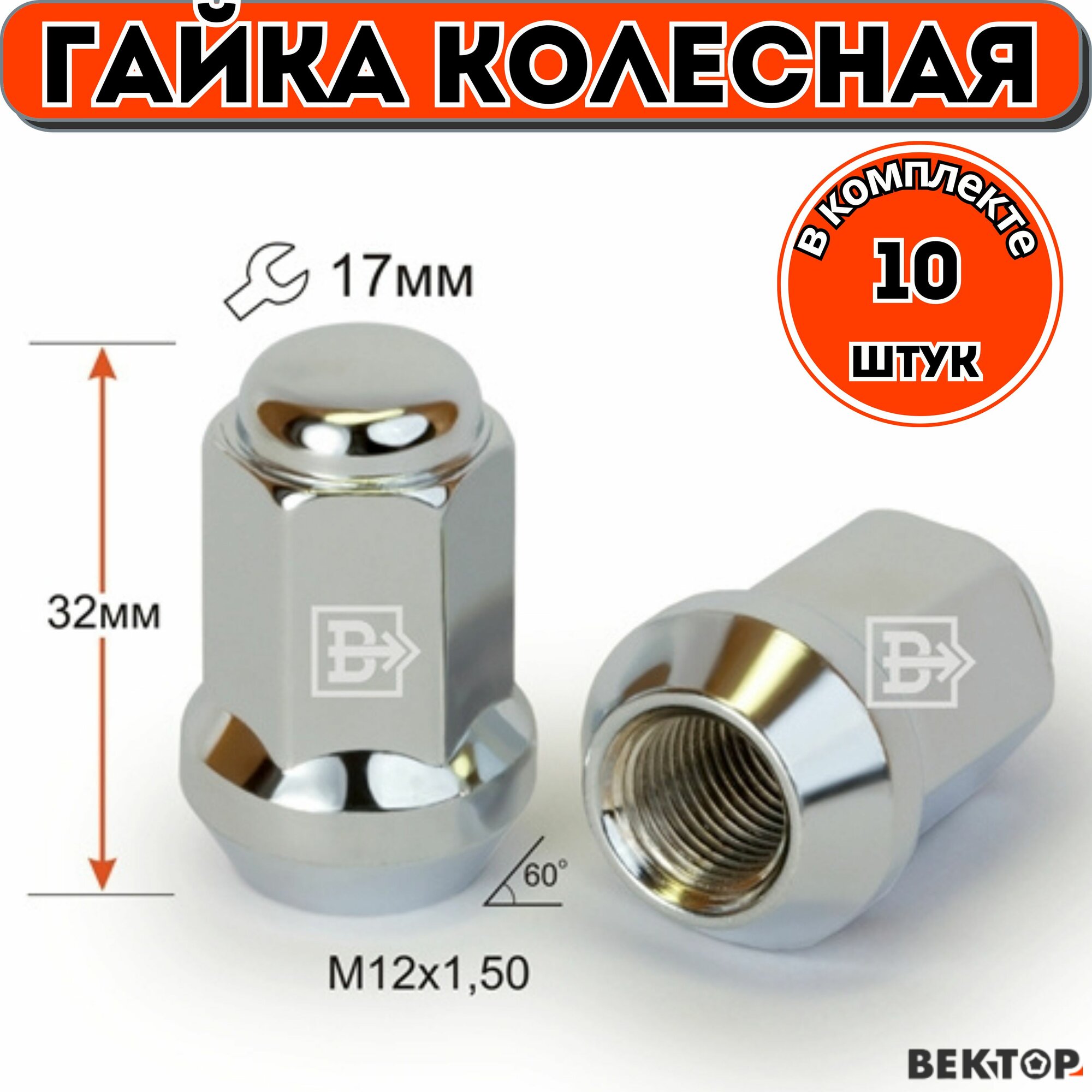 Гайка колесная M12X1,50 Хром высота 32 мм Конус ключ 17мм, 10 шт информация: