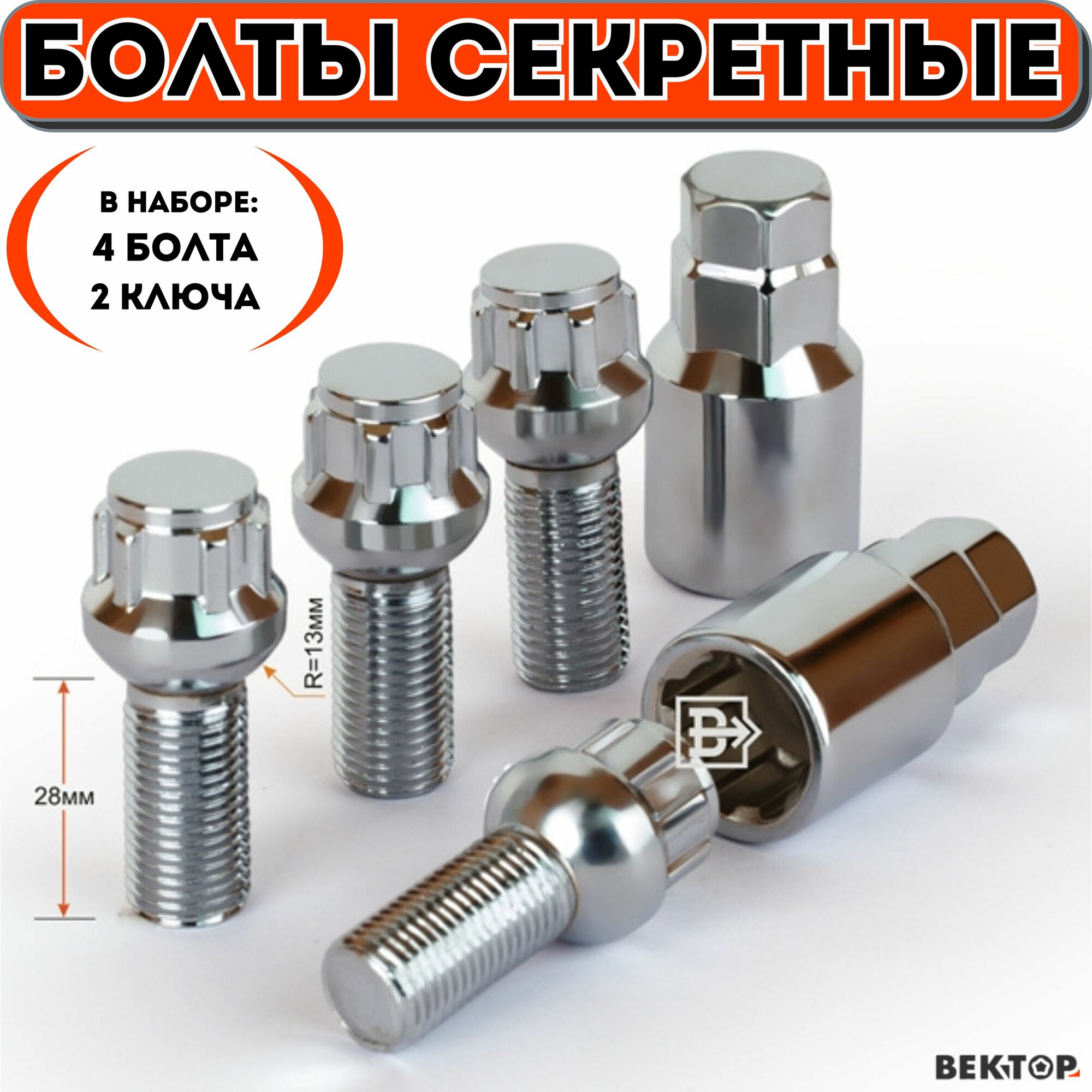 10 цен на Болты секретки М14х1,50 28 мм, Сфера , Хром, вектор (набор 4 болта+2 ключа)