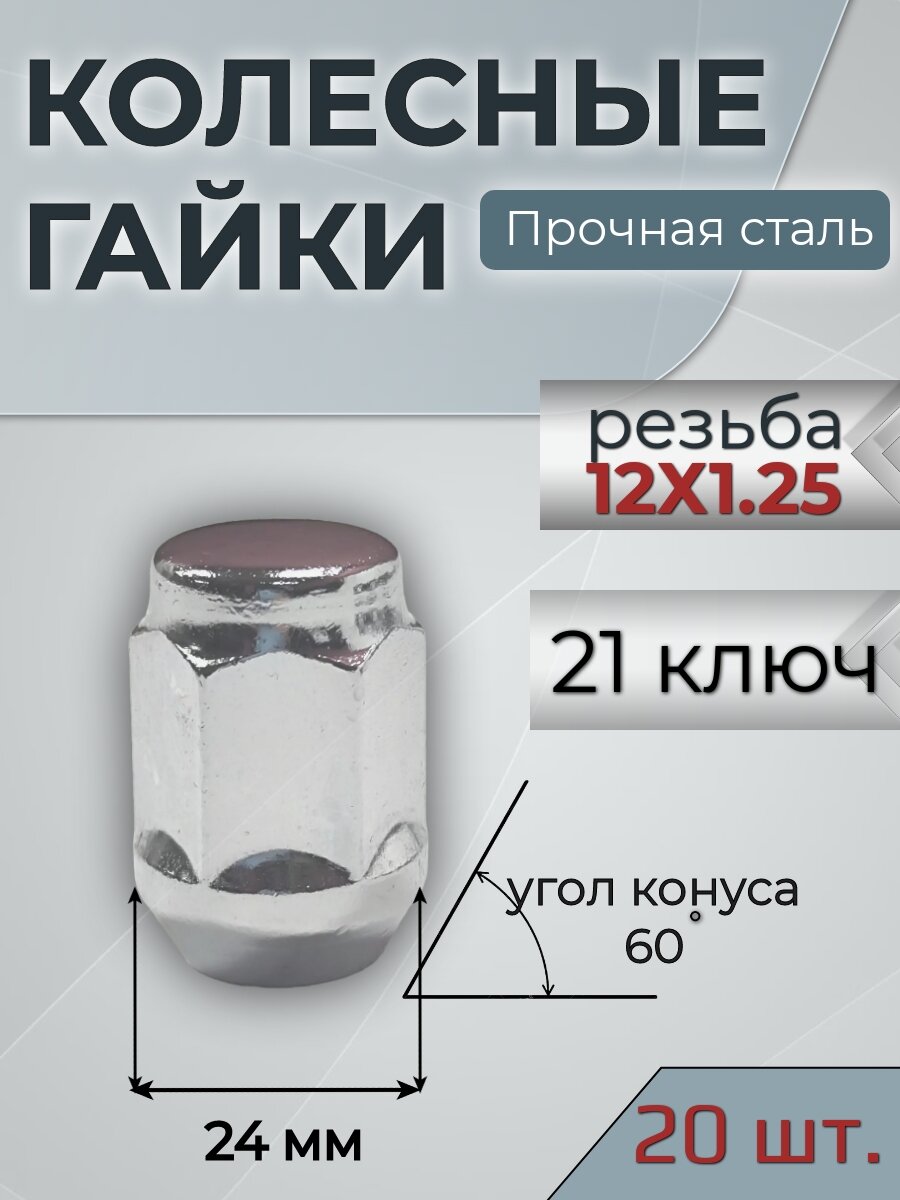 Комплект колесных гаек М12х1,25 (конус, ключ 21 мм, высота 35 мм ) комплект 20 штук, хром информация: