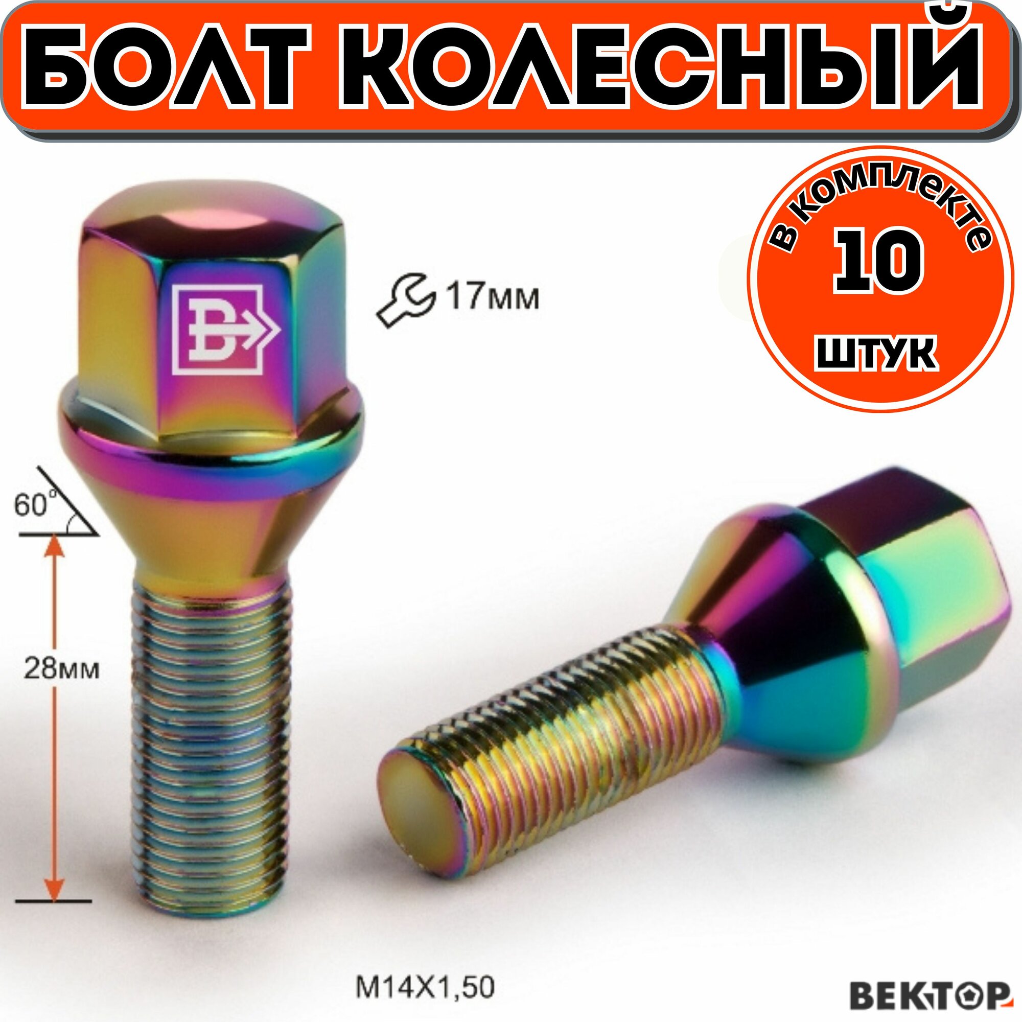 Болт колесный M14X1,50 28мм Радужный Титан Конус с выступом ключ 17 мм, 10 шт информация: