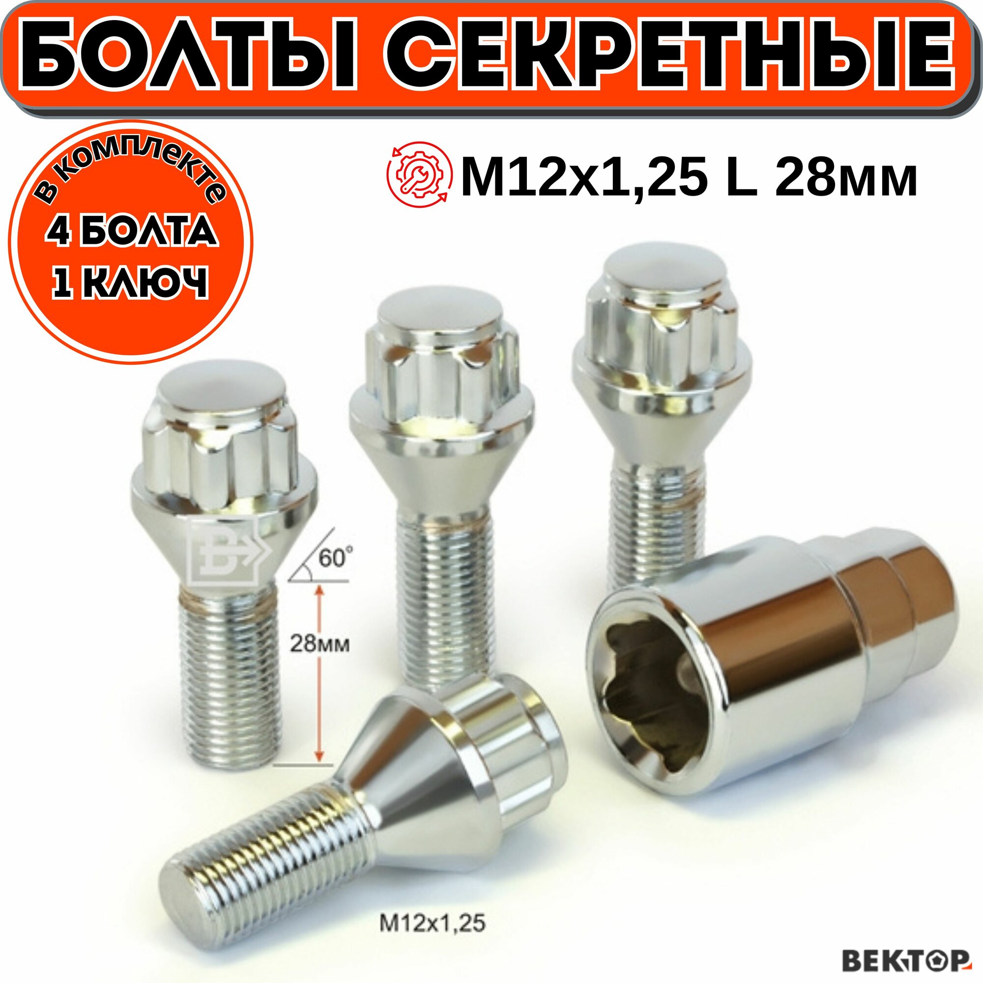 Болты секретки М12х1,25 L 28мм Конус Хром вектор ( набор 4 болта+1 ключ) информация: