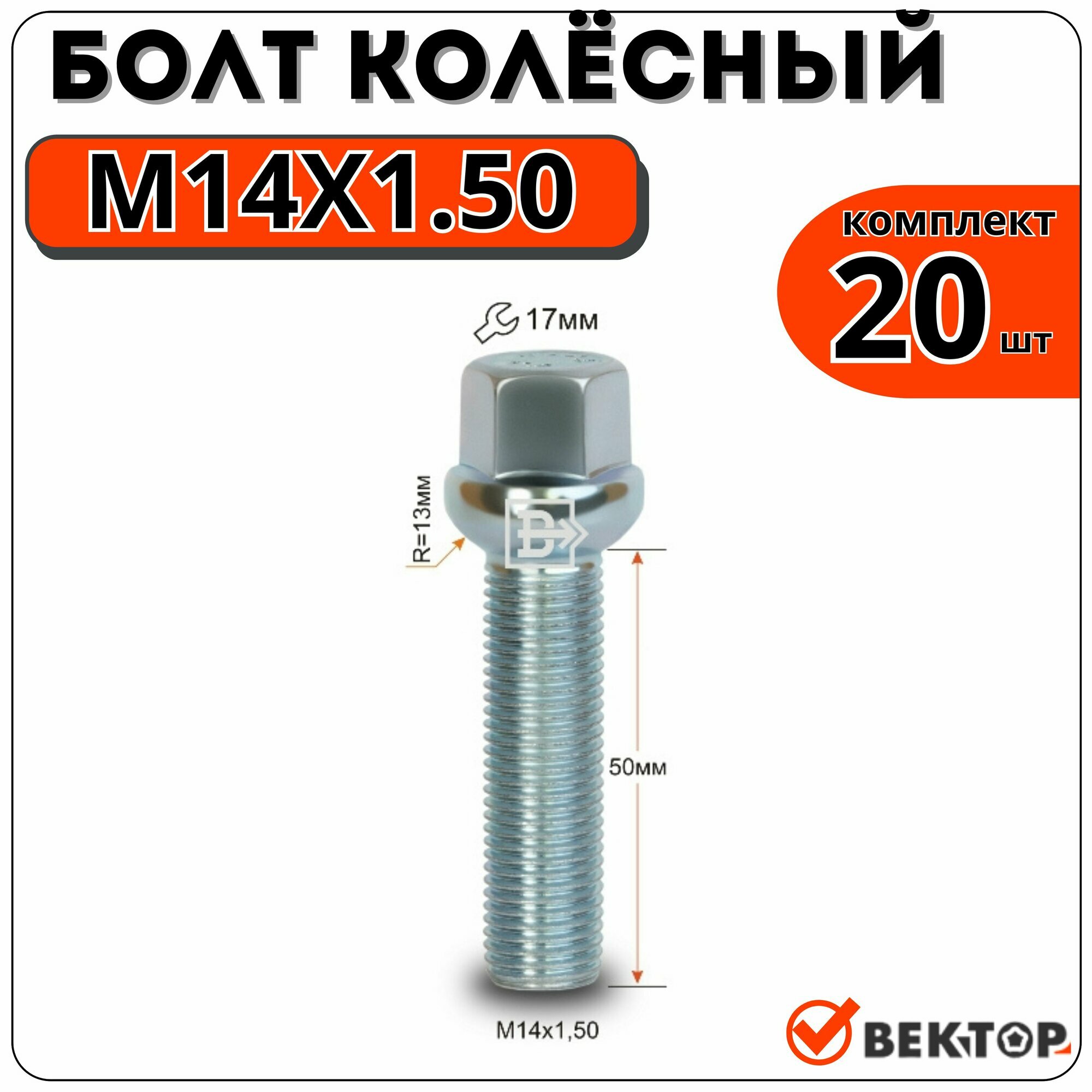 Болт колесный M14X1,50 50 мм Цинк Сфера с выступом ключ 17 мм, 20 шт информация: