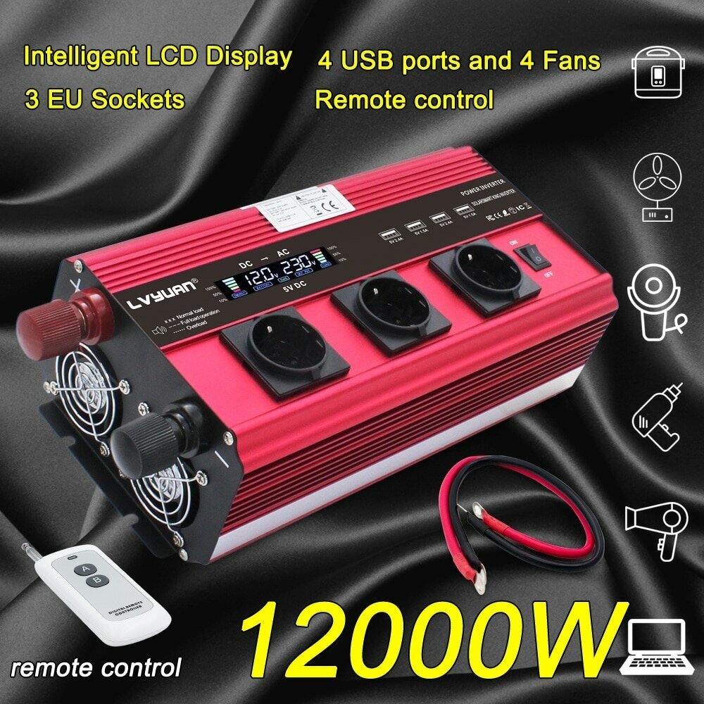 10 цен на Универсальный инвертор напряжения Lvyuan 12/24В-220В, 12000Вт, 3 розетки EU, пульт ДУ