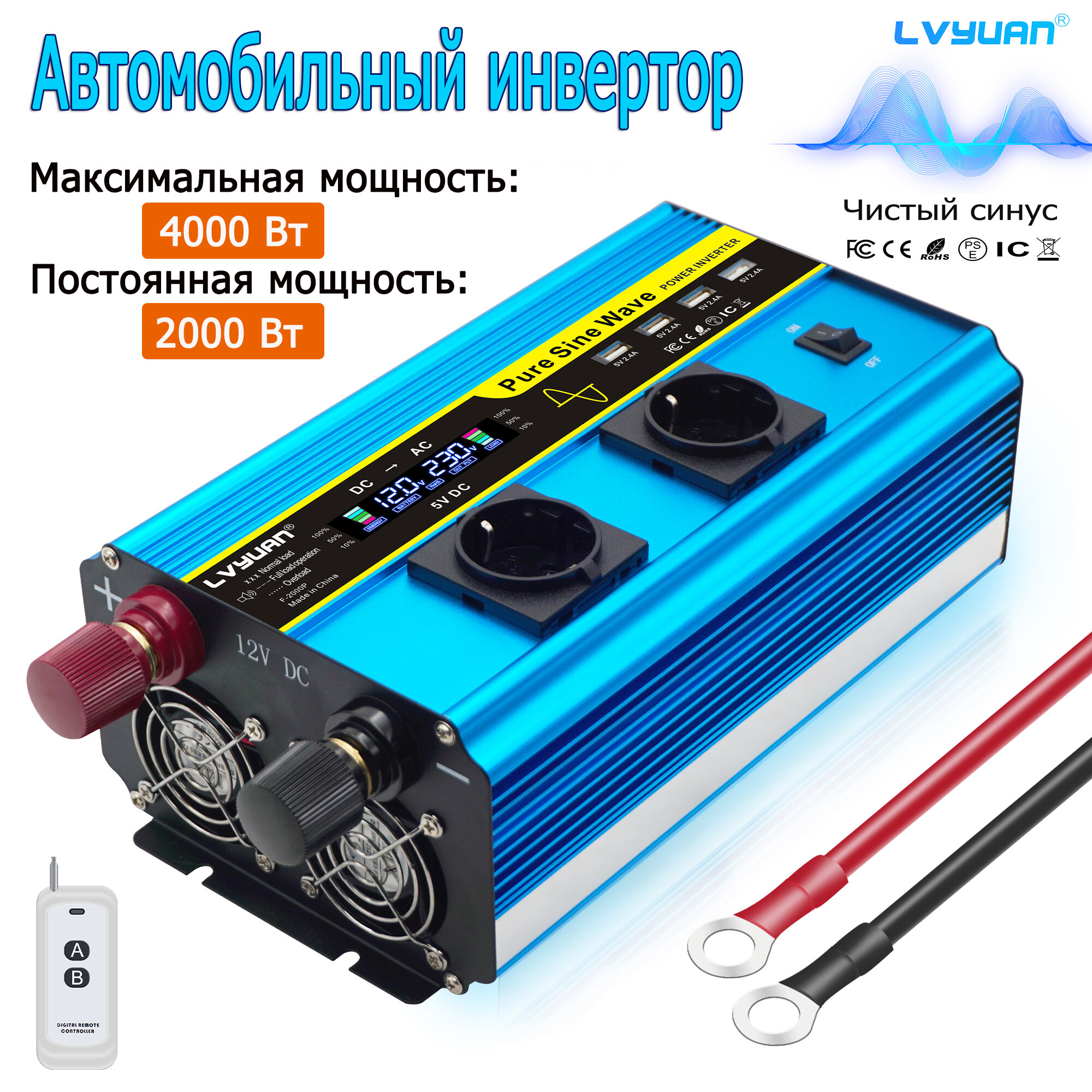 Автомобильный инвертор, чистый синус, 2000Вт, 12-220 В, с разъёмом 4USB, две розетки ЕС информация:
