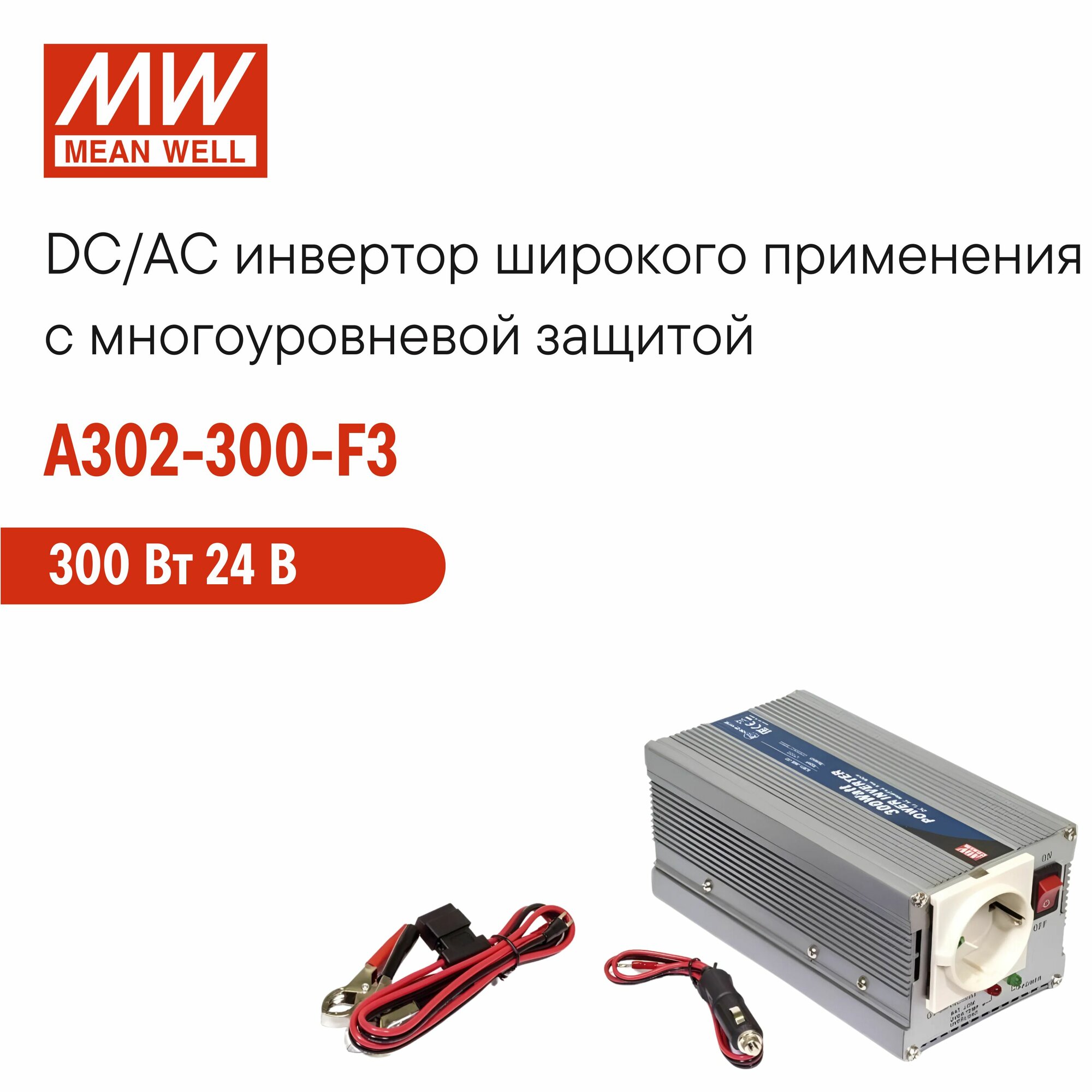10 цен на A302-300-F3 MEAN WELL, DC/AC преобразователь 24В/230В, 300Вт с вентилятором, кабелем для прикуривателя, кабелем крокодил