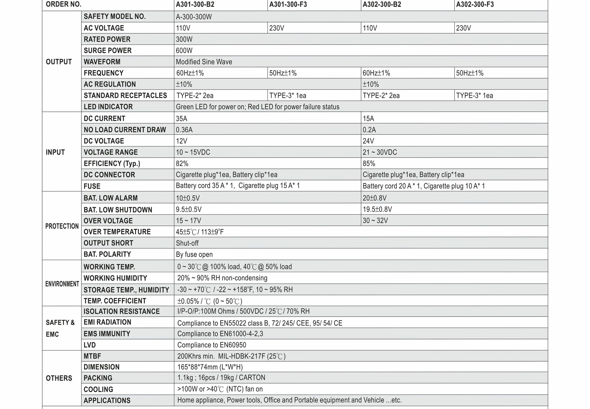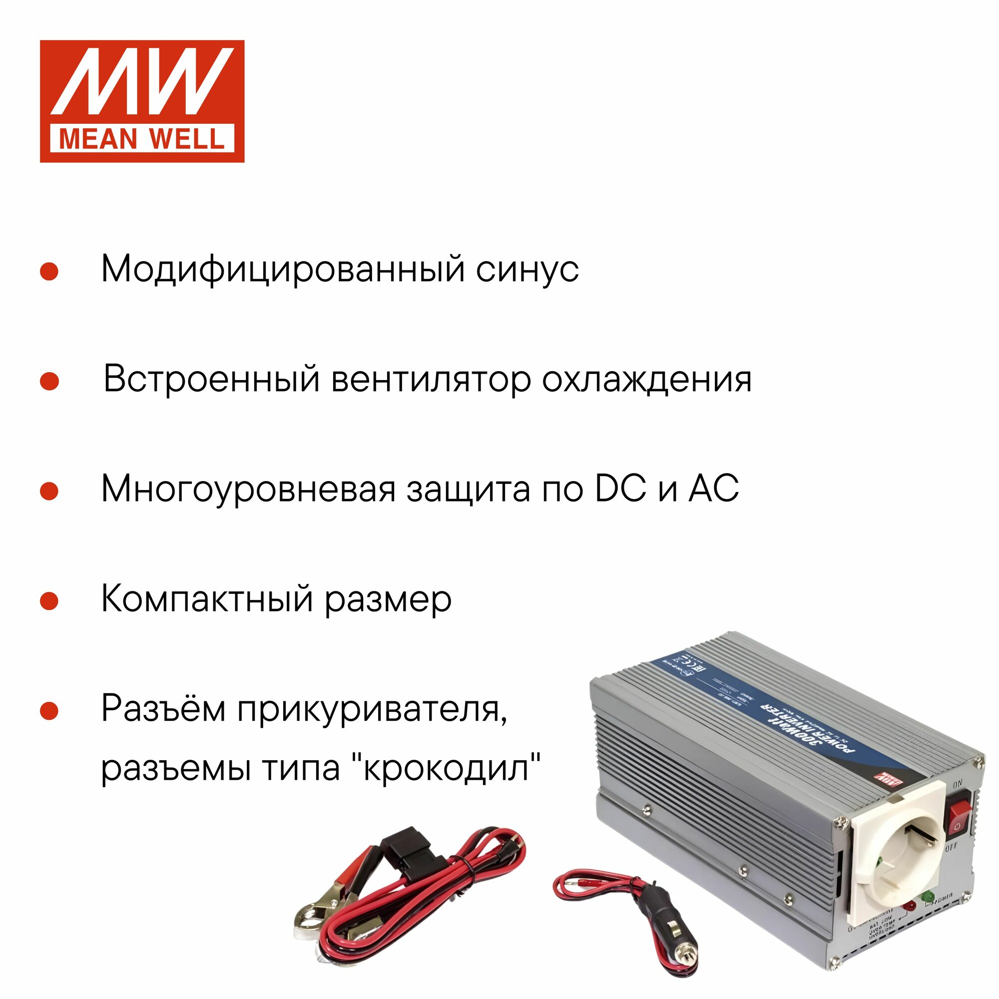 A302-300-F3 MEAN WELL, DC/AC преобразователь 24В/230В, 300Вт с вентилятором, кабелем для прикуривателя, кабелем крокодил информация: