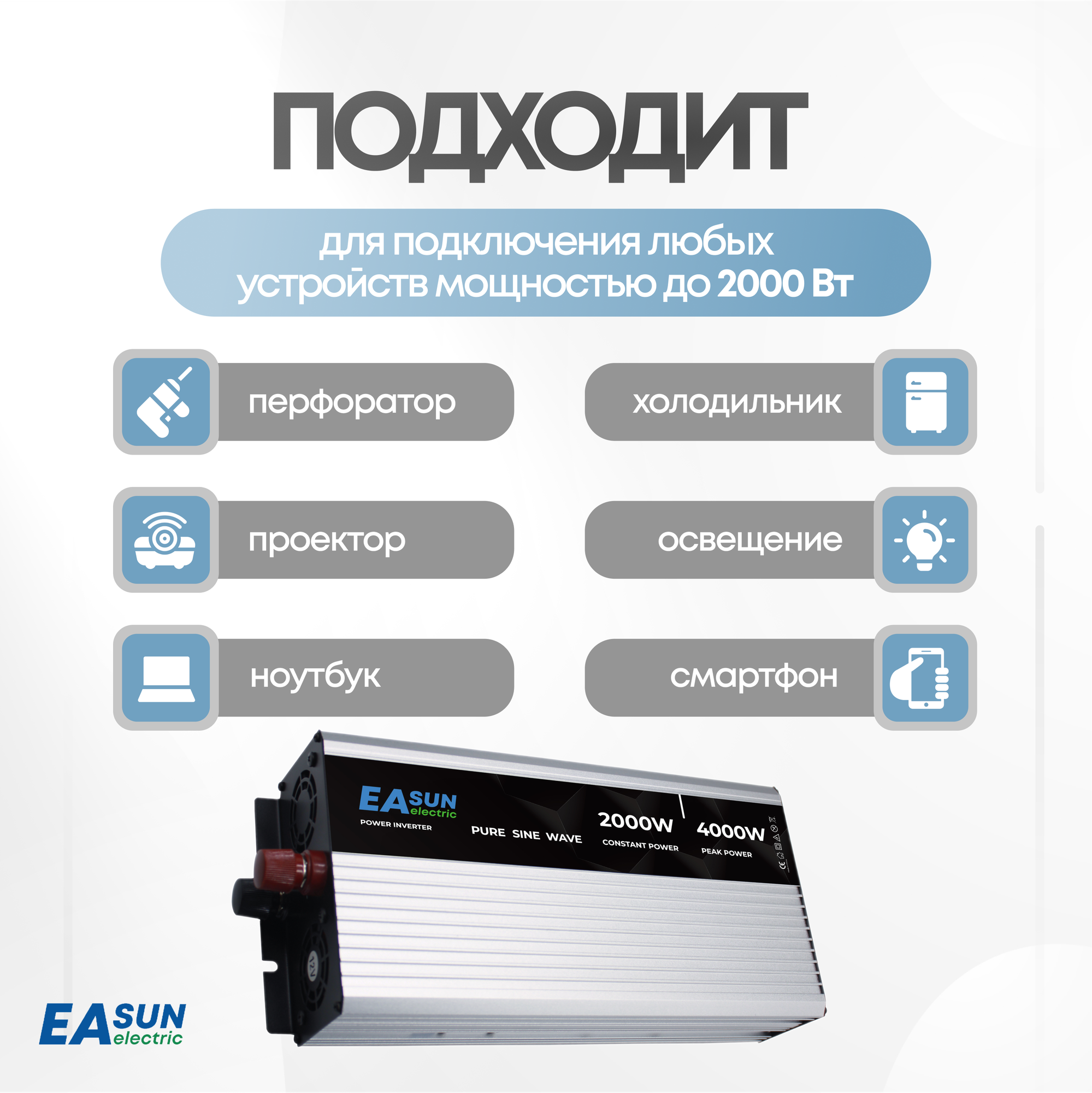 Инвертор автомобильный 12 220В, 4000Вт EASun Electric. Чистая синусоида. Преобразователь напряжения, трансформатор 12В в 220В информация: