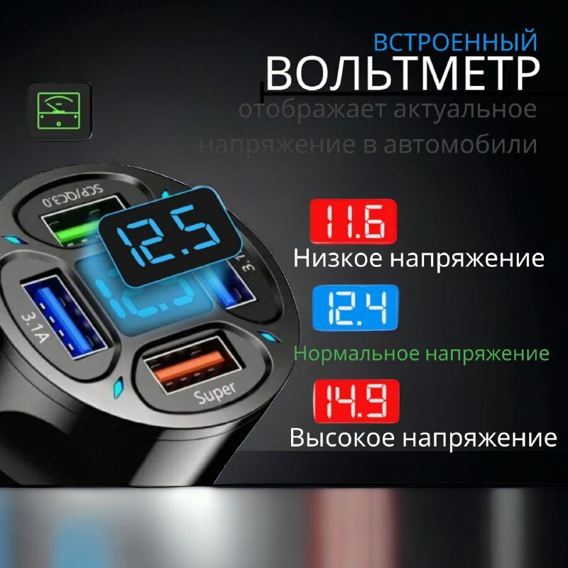 Автомобильное зарядное устройство, адаптер для быстрой зарядки прикуривателя, 4-портовый USB A, круглый информация:
