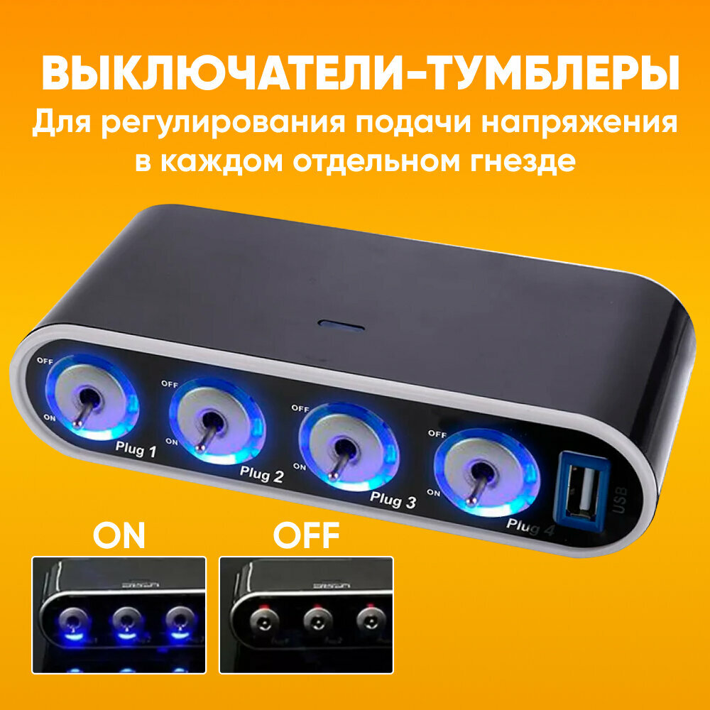 10 цен на Разветвитель прикуривателя на 4 гнезда + USB в авто/ Прикуриватель usb с LED подсветкой и выключателями-тумблерами